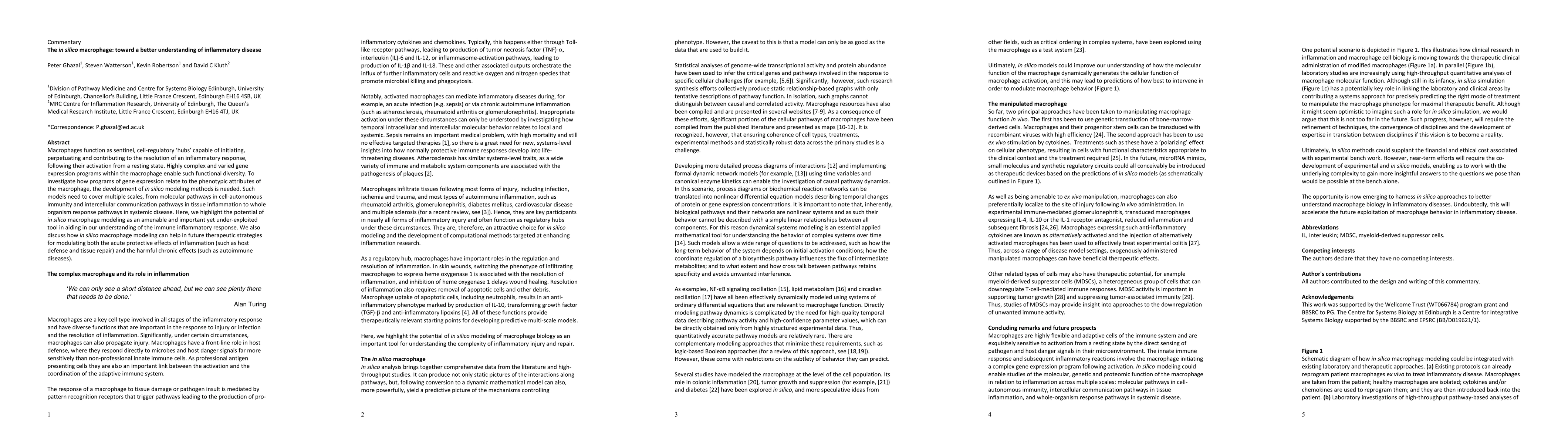 Macrophages function as sentinel, cell-regulatory hubs capable of initiating, perpetuating and contributing to the resolution of an inflammatory response, following their activation from a resting state. Highly complex and varied gene expression programs within the macrophage enable such functional diversity. To investigate how programs of gene expression relate to the phenotypic attributes of the macrophage, the development of in silico modeling methods is needed. Such models need to cover multiple scales, from molecular pathways in cell-autonomous immunity and intercellular communication pathways in tissue inflammation to whole organism response pathways in systemic disease. Here, we highlight the potential of in silico macrophage modeling as an amenable and important yet under-exploited tool in aiding in our understanding of the immune inflammatory response. We also discuss how in silico macrophage modeling can help in future therapeutic strategies for modulating both the acute protective effects of inflammation (such as host defense and tissue repair) and the harmful chronic effects (such as autoimmune diseases).