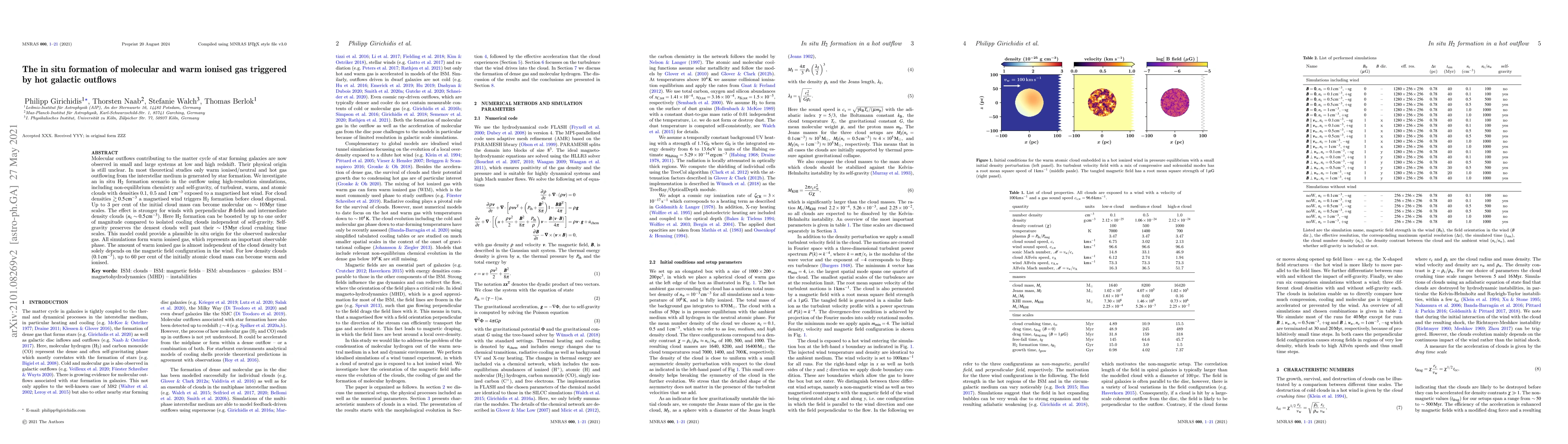 Molecular outflows contributing to the matter cycle of star forming galaxies are now observed in small and large systems at low and high redshift. Their physical origin is still unclear. In most theoretical studies only warm ionised/neutral and hot gas outflowing from the interstellar medium is generated by star formation. We investigate an in-situ H$_2$ formation scenario in the outflow using high-resolution simulations, including non-equilibrium chemistry and self-gravity, of turbulent, warm, and atomic clouds with densities 0.1, 0.5 and $1\,\mathrm{cm}^{-3}$ exposed to a magnetised hot wind. For cloud densities $\gtrsim 0.5\,\mathrm{cm}^{-3}$ a magnetised wind triggers H$_2$ formation before cloud dispersal. Up to 3 per cent of the initial cloud mass can become molecular on $\sim 10\,\mathrm{Myr}$ time scales. The effect is stronger for winds with perpendicular $B$-fields and intermediate density clouds ($n_\mathrm{c}\sim 0.5\,\mathrm{cm}^{-3}$). Here H$_2$ formation can be boosted by up to one order of magnitude compared to isolated cooling clouds independent of self-gravity. Self-gravity preserves the densest clouds way past their $\sim 15\,\mathrm{Myr}$ cloud crushing time scales. This model could provides a plausible in-situ origin for the observed molecular gas. Warm ionised gas is also generated, almost independent of the cloud density. The amount solely depend on the magnetic field configuration in the wind. For low density clouds ($0.1\,\mathrm{cm}^{-3}$), the forming warm ionised gas can be as much as 60 per cent of the initially atomic cloud mass. This could contribute to observations of outflows with ionised gas sensitive tracers.