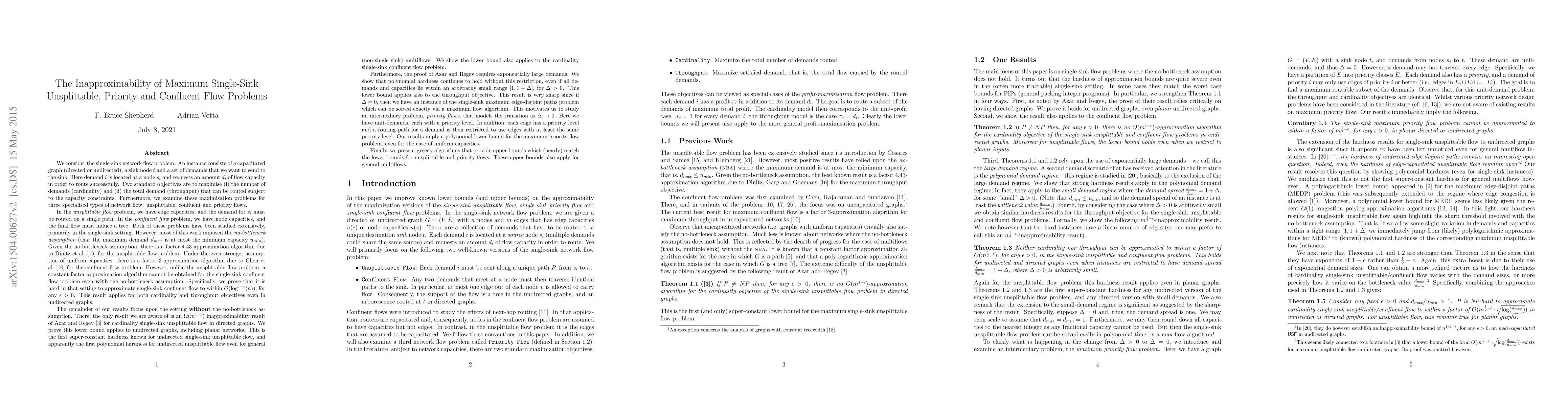 We consider single-sink network flow problems. An instance consists of a capacitated graph (directed or undirected), a sink node $t$ and a set of demands that we want to send to the sink. Here demand $i$ is located at a node $s_i$ and requests an amount $d_i$ of flow capacity in order to route successfully. Two standard objectives are to maximise (i) the number of demands (cardinality) and (ii) the total demand (throughput) that can be routed subject to the capacity constraints. Furthermore, we examine these maximisation problems for three specialised types of network flow: unsplittable, confluent and priority flows. In the {\em unsplittable flow} problem (UFP), we have edge capacities, and the demand for $s_i$ must be routed on a single path. In the {\em confluent flow} problem, we have node capacities, and the final flow must induce a tree. Both of these problems have been studied extensively, primarily in the single-sink setting. However, most of this work imposed the {\em no-bottleneck assumption} (that the maximum demand $d_{max}$ is at most the minimum capacity $u_{min}$). Given the no-bottleneck assumption (NBA), there is a factor $4.43$-approximation algorithm due to Dinitz et al. for the unsplittable flow problem. Under the stronger assumption of uniform capacities, there is a factor $3$-approximation algorithm due to Chen et al. for the confluent flow problem. However, unlike the UFP, we show that a constant factor approximation algorithm cannot be obtained for the single-sink confluent flows even {\bf with} the NBA. Without NBA, we show that maximum cardinality single-sink UFP is hard to approximate to within a factor $n^{.5-\epsilon}$ even when all demands lie in a small interval $[1,1+\Delta]$ where $\Delta>0$ (but has polynomial input size). This is very sharp since when $\Delta=0$, this becomes a maximum flow problem.