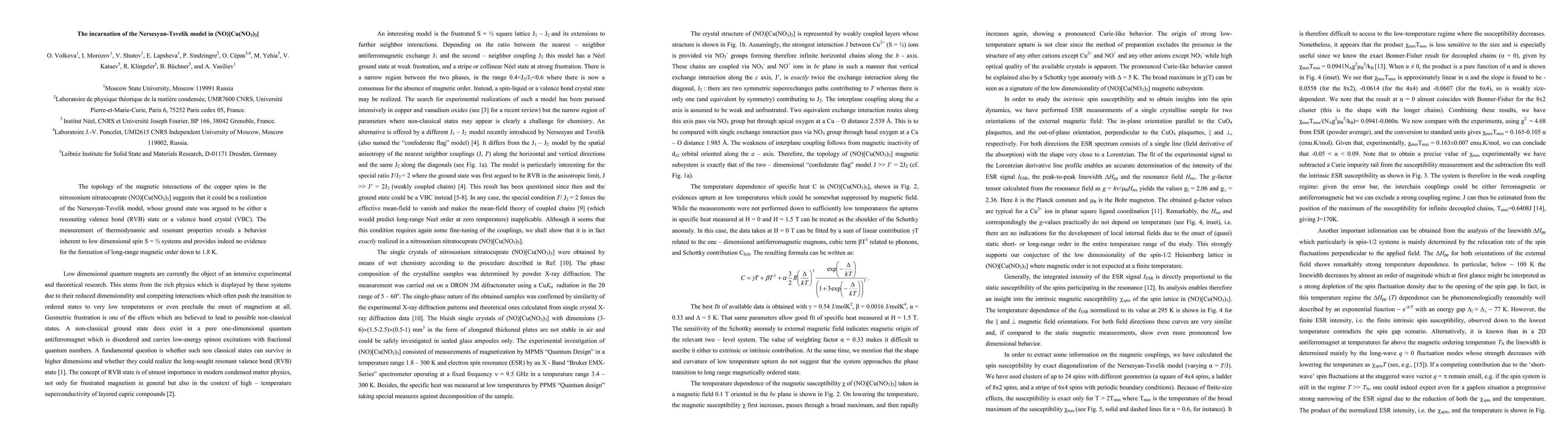 This study investigates the magnetic interactions in (NO)[Cu(NO3)3], suggesting it embodies the Nersesyan-Tsvelik model, potentially exhibiting a resonating valence bond or valence bond crystal ground state. Experimental results show behavior typical of low-dimensional spin systems, with no evidence of long-range magnetic order down to 1.8 K.