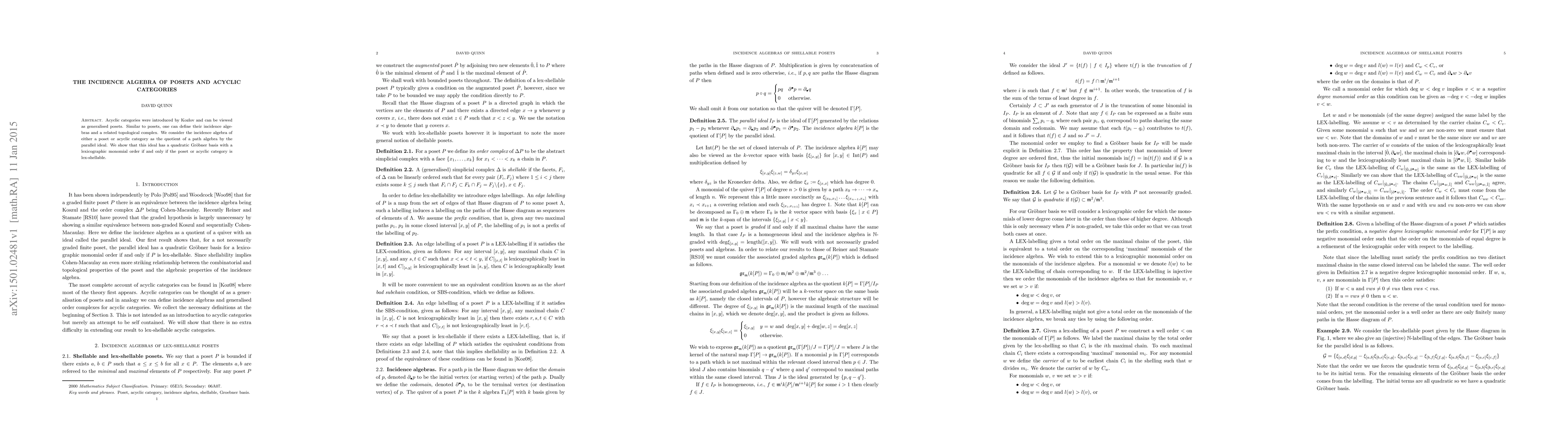 The paper explores the incidence algebras of posets and acyclic categories, demonstrating that these algebras, defined as quotients of path algebras by parallel ideals, have a quadratic Gröbner basis under a lexicographic order if the underlying structure is lex-shellable.