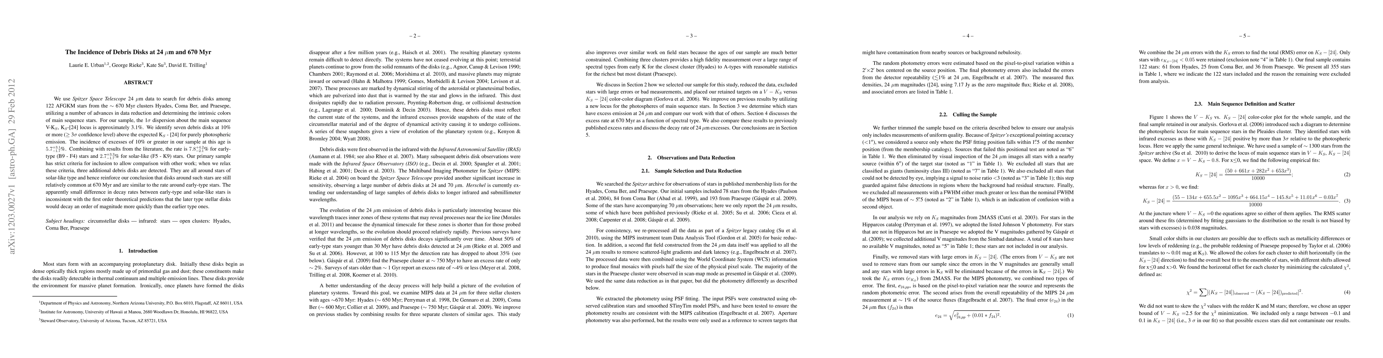 We use Spitzer Space Telescope 24 {\mu}m data to search for debris disks among 122 AFGKM stars from the \sim 670 Myr clusters Hyades, Coma Ber, and Praesepe, utilizing a number of advances in data reduction and determining the intrinsic colors of main sequence stars. For our sample, the 1{\sigma} dispersion about the main sequence V-K, K-[24] locus is approximately 3.1%. We identify seven debris disks at 10% or more (\geq 3{\sigma} confidence level) above the expected K-[24] for purely photospheric emission. The incidence of excesses of 10% or greater in our sample at this age is 5.7 +3.1/-1.7%. Combining with results from the literature, the rate is 7.8 +4.2/-2.1% for early- type (B9 - F4) stars and 2.7 +3.3/-1.7% for solar-like (F5 - K9) stars. Our primary sample has strict criteria for inclusion to allow comparison with other work; when we relax these criteria, three additional debris disks are detected. They are all around stars of solar-like type and hence reinforce our conclusion that disks around such stars are still relatively common at 670 Myr and are similar to the rate around early-type stars. The apparently small difference in decay rates between early-type and solar-like stars is inconsistent with the first order theoretical predictions that the later type stellar disks would decay an order of magnitude more quickly than the earlier type ones.