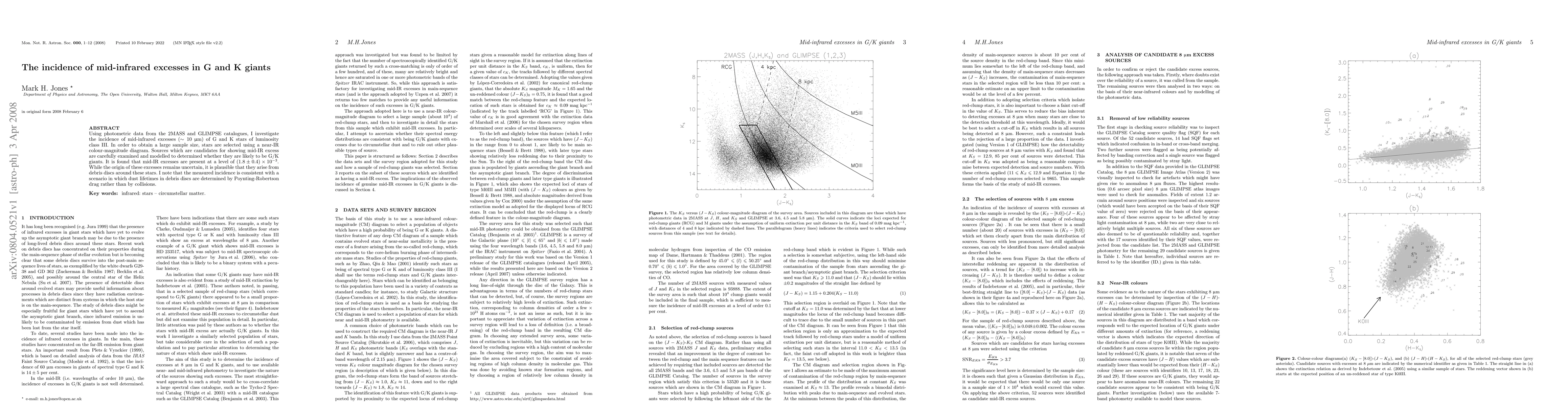 This study investigates the occurrence of mid-infrared excesses in G and K giants using data from 2MASS and GLIMSE catalogues, finding an incidence rate of (1.8 +/- 0.4) x 10^-3. The excesses may originate from debris discs, suggesting dust lifetimes are influenced by Poynting-Robertson drag rather than collisions.