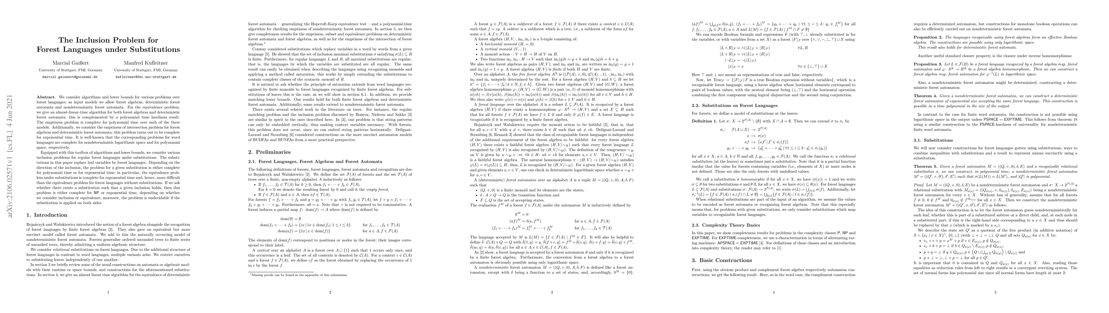 This paper investigates algorithms and complexity bounds for various problems in forest languages, including equivalence, emptiness, and intersection. It finds an almost-linear-time algorithm for equivalence over forest algebras and deterministic forest automata but also highlights polynomial time hardness. The inclusion problem under substitutions, which replaces leaf variables with forest languages, is shown to be either complete for polynomial or exponential time, indicating a significant increase in complexity compared to forest languages without substitutions.