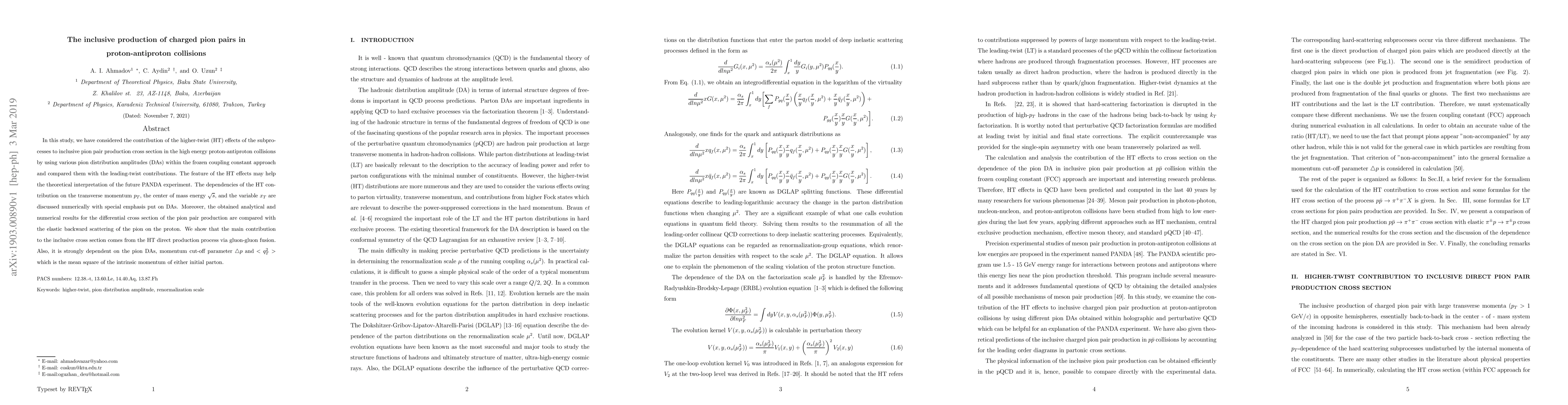 This study investigates the higher-twist effects in inclusive charged pion pair production during high-energy proton-antiproton collisions, comparing these effects with leading-twist contributions. The analysis reveals that the main contribution to the cross section comes from the higher-twist direct production via gluon-gluon fusion, significantly influenced by pion distribution amplitudes and intrinsic momentum parameters.
