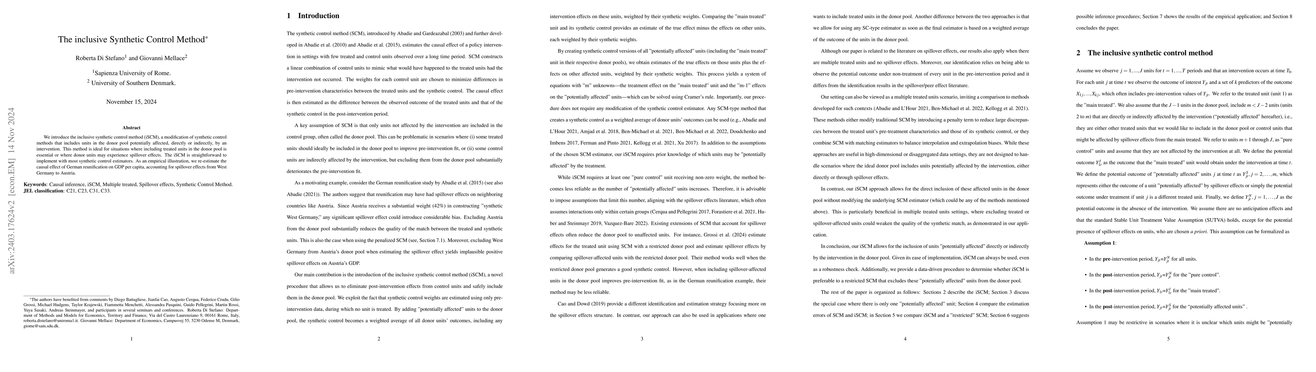 The inclusive synthetic control method (iSCM) allows for the inclusion of donor units potentially affected by an intervention, suitable for cases with multiple treated units or spillover effects. An empirical application re-estimates the causal impact of German reunification on Austria's GDP per capita, accounting for spillovers from West Germany.