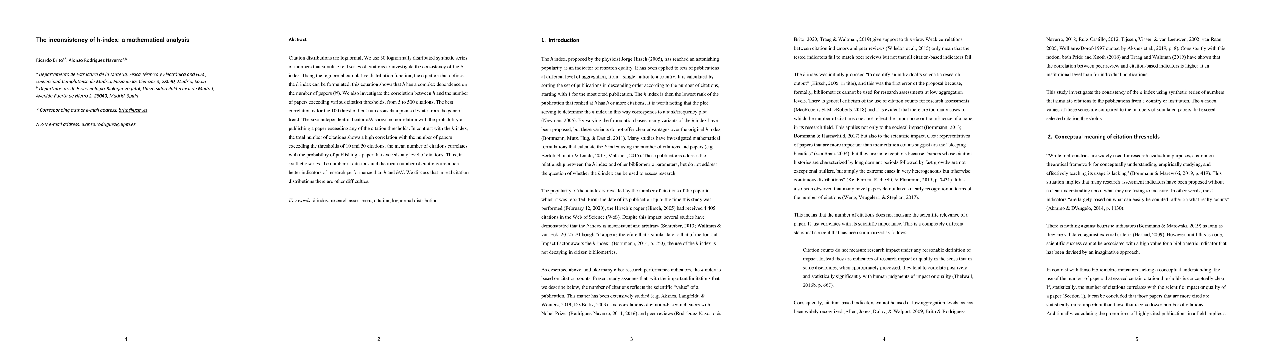 Citation distributions are lognormal. We use 30 lognormally distributed synthetic series of numbers that simulate real series of citations to investigate the consistency of the h index. Using the lognormal cumulative distribution function, the equation that defines the h index can be formulated; this equation shows that h has a complex dependence on the number of papers (N). We also investigate the correlation between h and the number of papers exceeding various citation thresholds, from 5 to 500 citations. The best correlation is for the 100 threshold but numerous data points deviate from the general trend. The size-independent indicator h/N shows no correlation with the probability of publishing a paper exceeding any of the citation thresholds. In contrast with the h index, the total number of citations shows a high correlation with the number of papers exceeding the thresholds of 10 and 50 citations; the mean number of citations correlates with the probability of publishing a paper that exceeds any level of citations. Thus, in synthetic series, the number of citations and the mean number of citations are much better indicators of research performance than h and h/N. We discuss that in real citation distributions there are other difficulties.