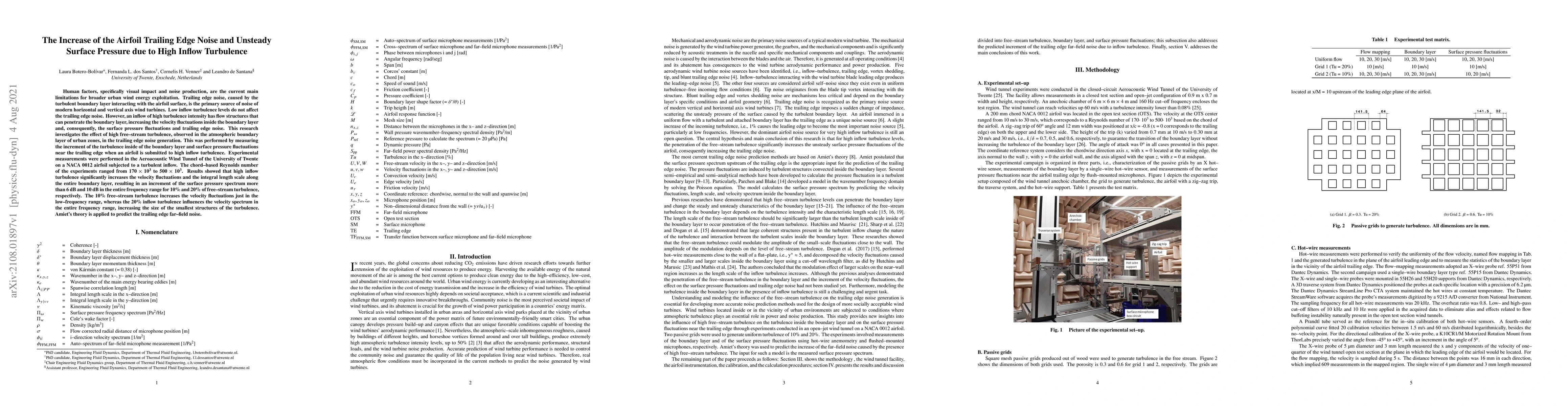 Human factors, specifically visual impact and noise production, are the current main limitations for broader urban wind energy exploitation. Trailing edge noise, caused by the turbulent boundary layer interacting with the airfoil surface, is the primary source of noise of modern horizontal and vertical axis wind turbines. Low inflow turbulence levels do not affect the trailing edge noise. However, an inflow of high turbulence intensity has flow structures that can penetrate the boundary layer, increasing the velocity fluctuations inside the boundary layer and, consequently, the wall pressure fluctuations and trailing edge noise. This research investigates the effect of high free-stream turbulence, observed in the atmospheric boundary layer of urban zones, in the trailing edge noise generation. This was performed by measuring the increment of the turbulence inside of the boundary layer and surface pressure fluctuations near the trailing edge when an airfoil is submitted to high inflow turbulence. Experimental measurements were performed in the Aeroacoustic Wind Tunnel of the University of Twente on a NACA 0012 airfoil subjected to a turbulent inflow. The chord-based Reynolds number of the experiments ranged from 170 x 10^3 to 500 x 10^3. Results showed that high inflow turbulence significantly increases the velocity fluctuations and the integral length scale along the entire boundary layer, resulting in an increment of the surface pressure spectrum more than 6 dB and 10 dB in the entire frequency range for 10% and 20% of free-stream turbulence, respectively. The 10% free-stream turbulence increases the velocity fluctuations just in the low--frequency range, whereas the 20% inflow turbulence influences the velocity spectrum in the entire frequency range, increasing the size of the smallest structures of the turbulence. Amiet's theory is applied to predict the trailing edge far-field noise.