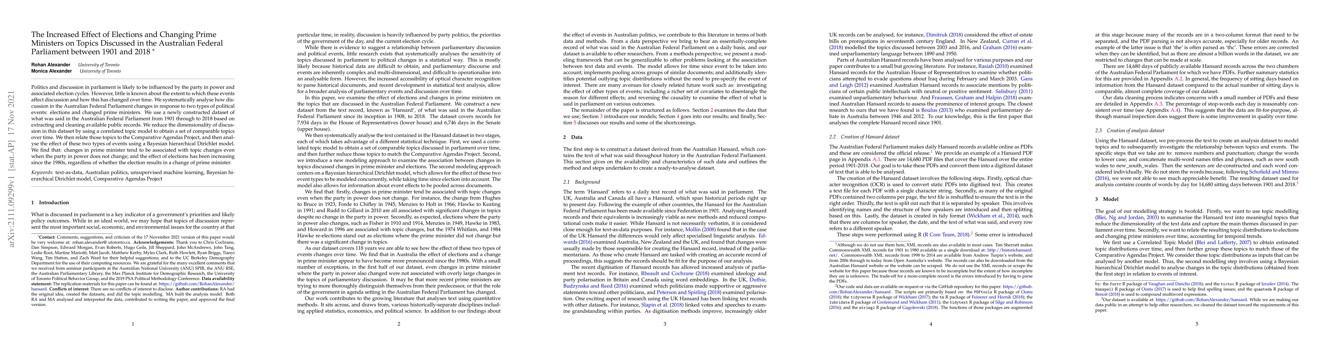 Politics and discussion in parliament is likely to be influenced by the party in power and associated election cycles. However, little is known about the extent to which these events affect discussion and how this has changed over time. We systematically analyse how discussion in the Australian Federal Parliament changes in response to two types of political events: elections and changed prime ministers. We use a newly constructed dataset of what was said in the Australian Federal Parliament from 1901 through to 2018 based on extracting and cleaning available public records. We reduce the dimensionality of discussion in this dataset by using a correlated topic model to obtain a set of comparable topics over time. We then relate those topics to the Comparative Agendas Project, and then analyse the effect of these two types of events using a Bayesian hierarchical Dirichlet model. We find that: changes in prime minister tend to be associated with topic changes even when the party in power does not change; and the effect of elections has been increasing since the 1980s, regardless of whether the election results in a change of prime minister.