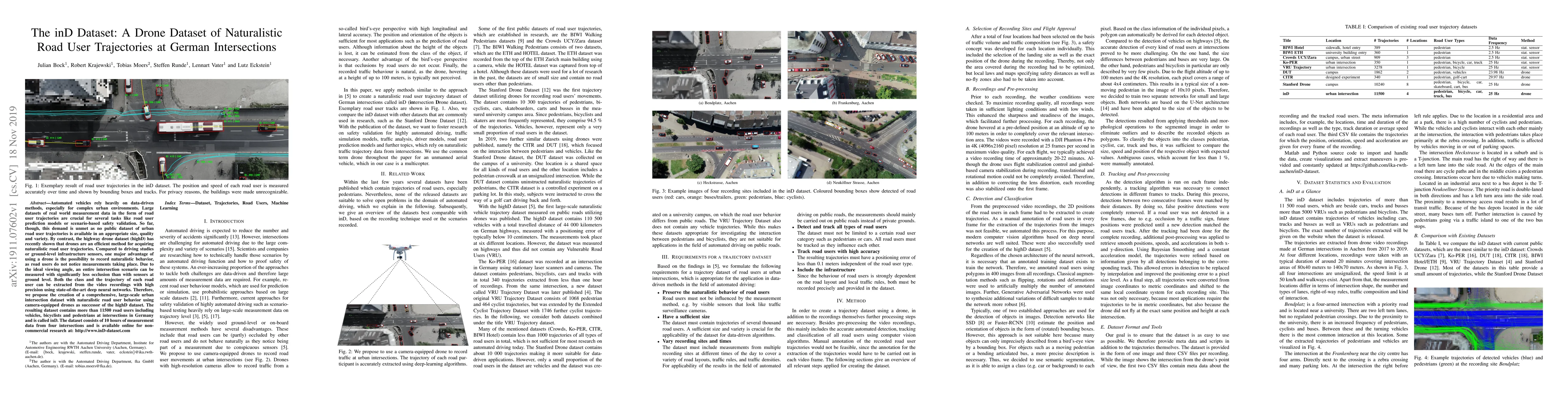 Automated vehicles rely heavily on data-driven methods, especially for complex urban environments. Large datasets of real world measurement data in the form of road user trajectories are crucial for several tasks like road user prediction models or scenario-based safety validation. So far, though, this demand is unmet as no public dataset of urban road user trajectories is available in an appropriate size, quality and variety. By contrast, the highway drone dataset (highD) has recently shown that drones are an efficient method for acquiring naturalistic road user trajectories. Compared to driving studies or ground-level infrastructure sensors, one major advantage of using a drone is the possibility to record naturalistic behavior, as road users do not notice measurements taking place. Due to the ideal viewing angle, an entire intersection scenario can be measured with significantly less occlusion than with sensors at ground level. Both the class and the trajectory of each road user can be extracted from the video recordings with high precision using state-of-the-art deep neural networks. Therefore, we propose the creation of a comprehensive, large-scale urban intersection dataset with naturalistic road user behavior using camera-equipped drones as successor of the highD dataset. The resulting dataset contains more than 11500 road users including vehicles, bicyclists and pedestrians at intersections in Germany and is called inD. The dataset consists of 10 hours of measurement data from four intersections and is available online for non-commercial research at: http://www.inD-dataset.com