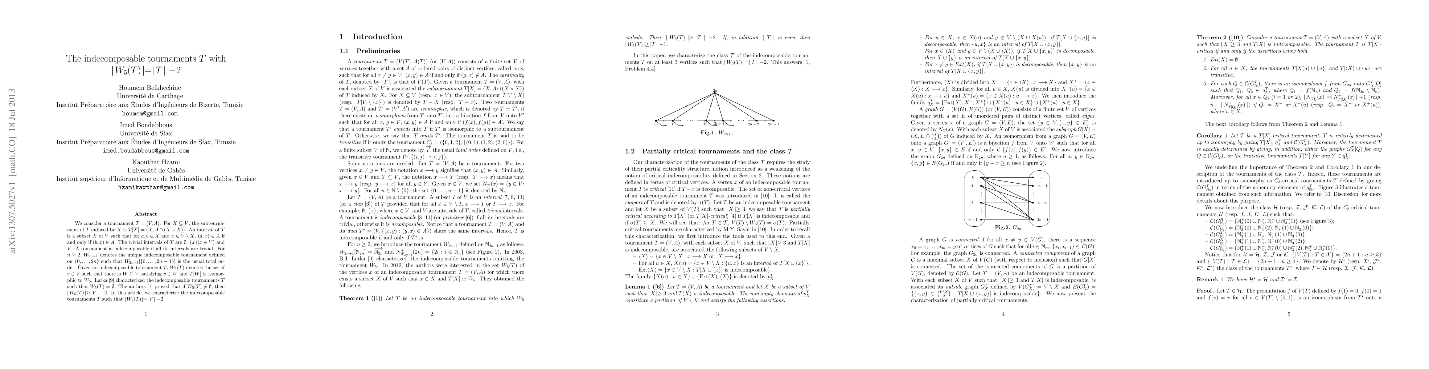 We consider a tournament $T=(V, A)$. For $X\subseteq V$, the subtournament of $T$ induced by $X$ is $T[X] = (X, A \cap (X \times X))$. An interval of $T$ is a subset $X$ of $V$ such that for $a, b\in X$ and $ x\in V\setminus X$, $(a,x)\in A$ if and only if $(b,x)\in A$. The trivial intervals of $T$ are $\emptyset$, $\{x\}(x\in V)$ and $V$. A tournament is indecomposable if all its intervals are trivial. For $n\geq 2$, $W_{2n+1}$ denotes the unique indecomposable tournament defined on $\{0,\dots,2n\}$ such that $W_{2n+1}[\{0,\dots,2n-1\}]$ is the usual total order. Given an indecomposable tournament $T$, $W_{5}(T)$ denotes the set of $v\in V$ such that there is $W\subseteq V$ satisfying $v\in W$ and $T[W]$ is isomorphic to $W_{5}$. Latka \cite{BJL} characterized the indecomposable tournaments $T$ such that $W_{5}(T)=\emptyset$. The authors \cite{HIK} proved that if $W_{5}(T)\neq \emptyset$, then $\mid W_{5}(T) \mid \geq \mid V \mid -2$. In this article, we characterize the indecomposable tournaments $T$ such that $\mid W_{5}(T) \mid = \mid V \mid -2$.