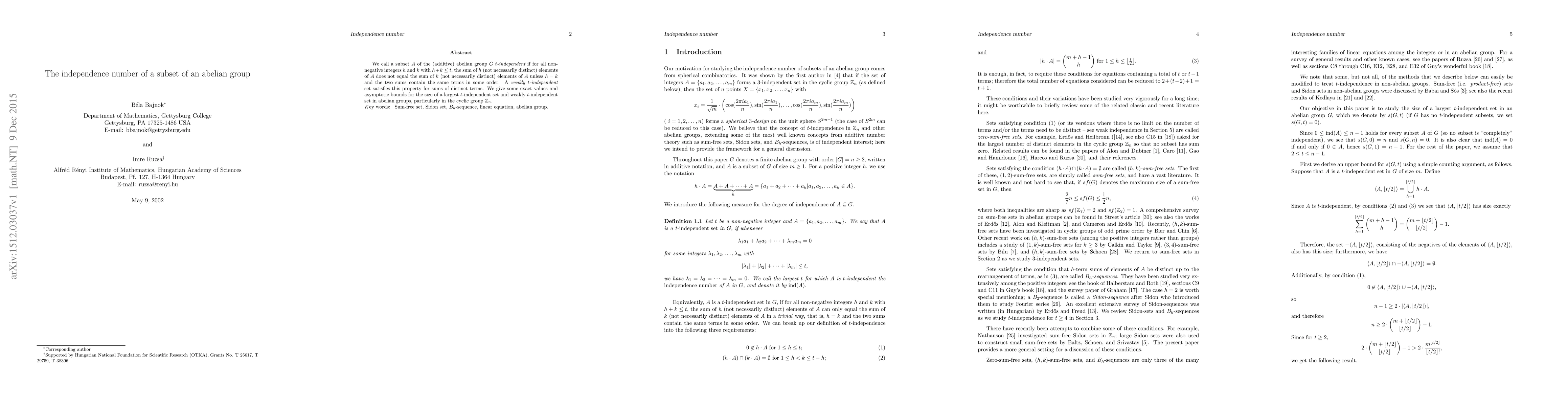We call a subset $A$ of the (additive) abelian group $G$ {\it $t$-independent} if for all non-negative integers $h$ and $k$ with $h+k \leq t$, the sum of $h$ (not necessarily distinct) elements of $A$ does not equal the sum of $k$ (not necessarily distinct) elements of $A$ unless $h=k$ and the two sums contain the same terms in some order. A {\it weakly $t$-independent} set satisfies this property for sums of distinct terms. We give some exact values and asymptotic bounds for the size of a largest $t$-independent set and weakly $t$-independent set in abelian groups, particularly in the cyclic group ${\mathbb Z}_n$.
