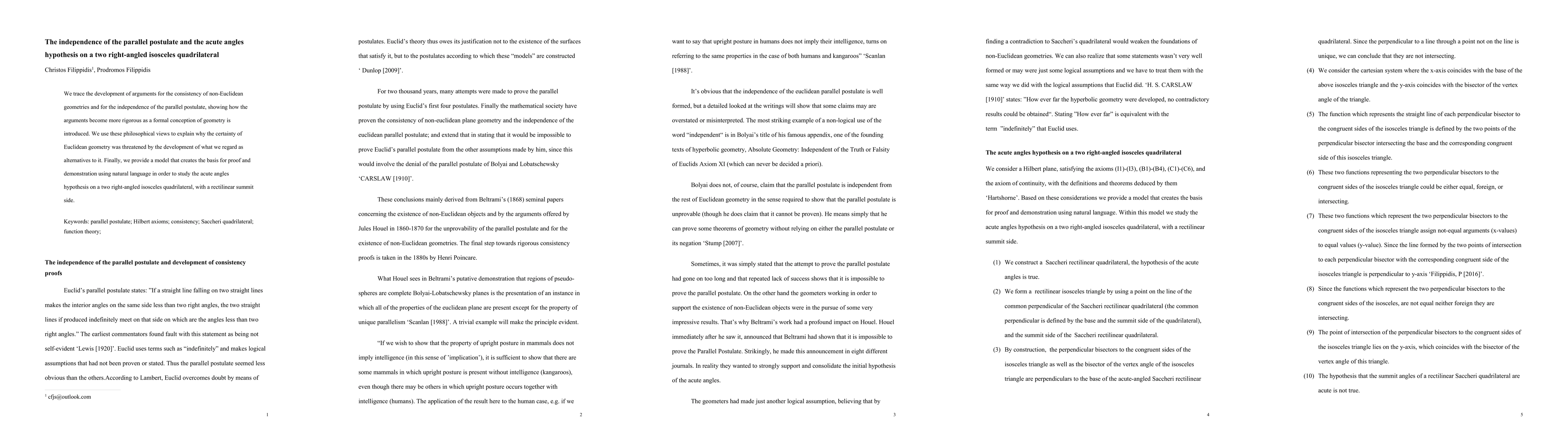 We trace the development of arguments for the consistency of non-Euclidean geometries and for the independence of the parallel postulate, showing how the arguments become more rigorous as a formal conception of geometry is introduced. We use these philosophical views to explain why the certainty of Euclidean geometry was threatened by the development of what we regard as alternatives to it. Finally, we provide a model that creates the basis for proof and demonstration using natural language in order to study the acute angles hypothesis on a two right-angled isosceles quadrilateral, with a rectilinear summit side.