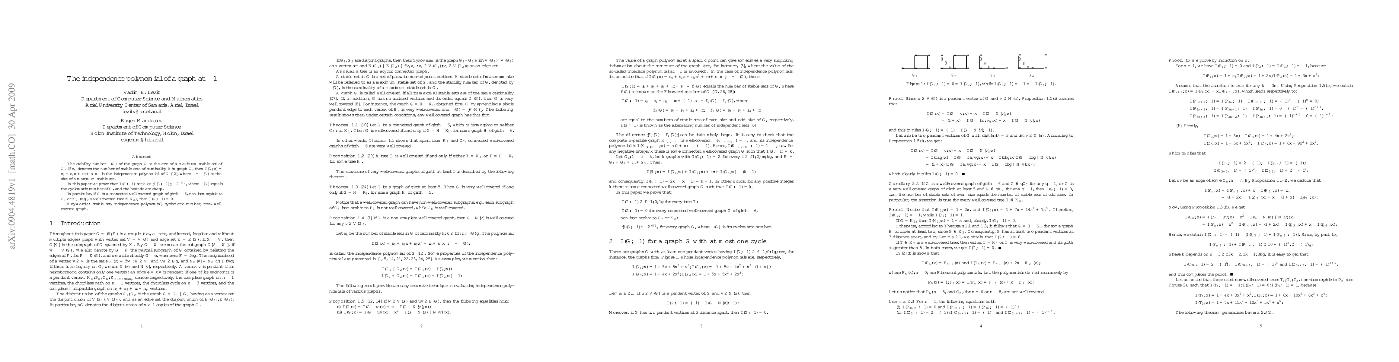 If alpha=alpha(G) is the maximum size of an independent set and s_{k} equals the number of stable sets of cardinality k in graph G, then I(G;x)=s_{0}+s_{1}x+...+s_{alpha}x^{alpha} is the independence polynomial of G. In this paper we prove that: 1. I(T;-1) equels either -1 or 0 or 1 for every tree T; 2. I(G;-1)=0 for every connected well-covered graph G of girth > 5, non-isomorphic to C_{7} or K_{2}; 3. the absolute value of I(G;-1) is not greater than 2^nu(G), for every graph G, where nu(G) is its cyclomatic number.