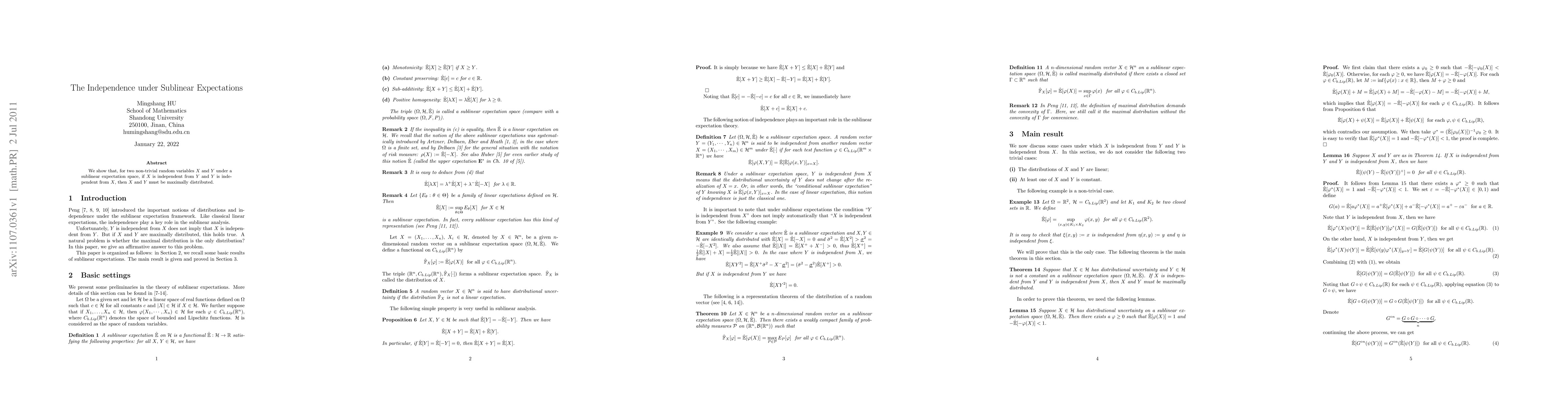 Summary: This paper demonstrates that under sublinear expectations, two non-trivial random variables X and Y are independent if and only if they are maximally distributed, establishing a strong connection between independence and distribution in this context.