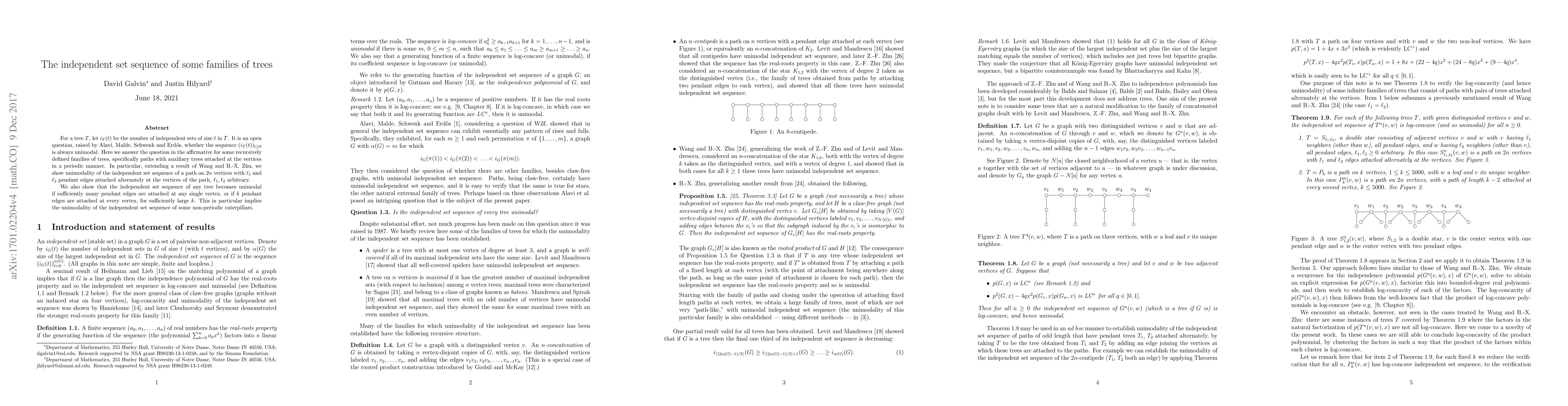 The paper investigates the unimodality of the independent set sequence for certain families of trees, utilizing recursive definitions and dropping pendant edges from vertices in a periodic manner.