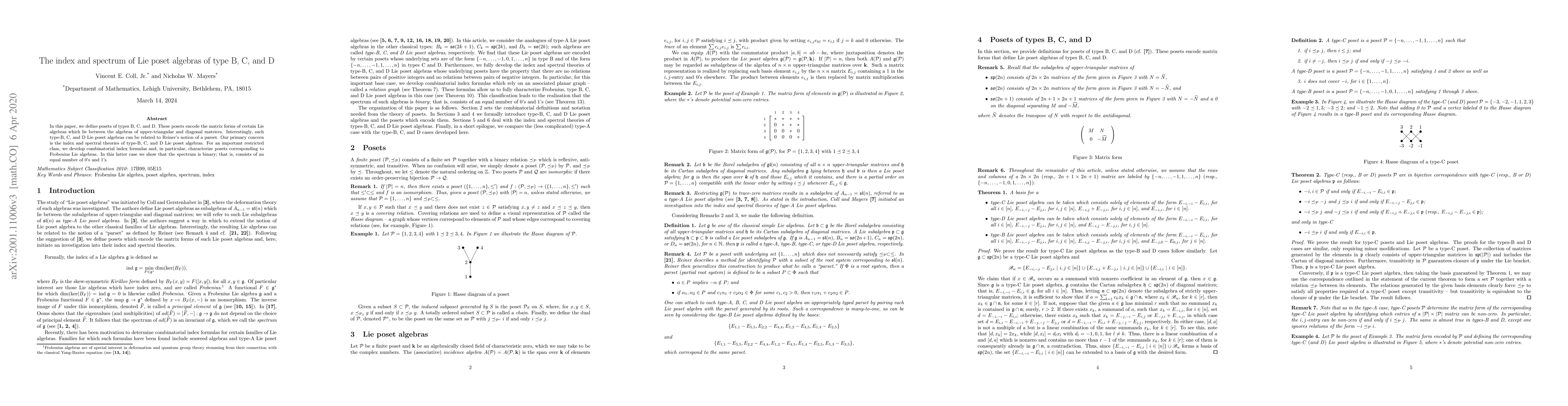 This paper defines posets of types B, C, and D that encode intermediate forms of Lie algebras, and explores their index and spectral theories. It develops combinatorial index formulas for a restricted class and shows that the spectrum of posets corresponding to Frobenius Lie algebras is binary.