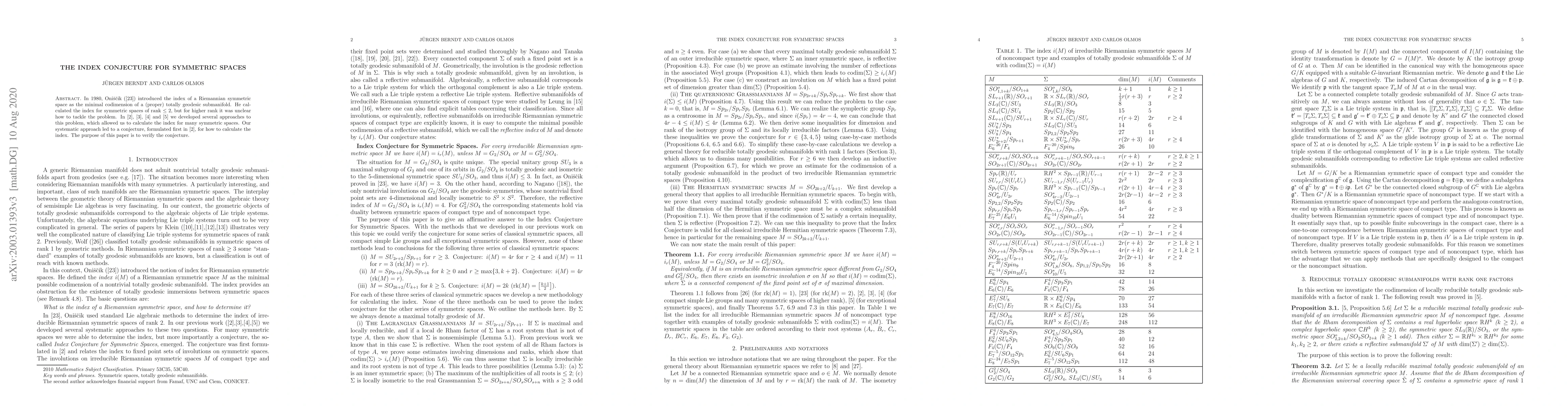 Researchers verify the Index Conjecture for Symmetric Spaces, a conjecture that calculates the index of a Riemannian symmetric space as the minimal codimension of its totally geodesic submanifolds.