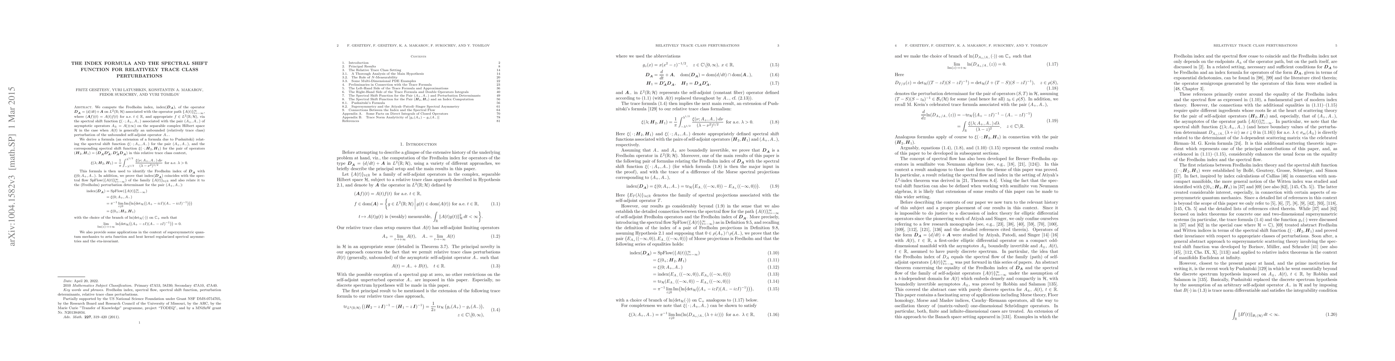 This paper computes the Fredholm index of the operator $D_A$ using the spectral shift function and derives a formula relating it to the spectral shift function of another operator pair. It establishes the equivalence of the Fredholm index with the spectral flow and the perturbation determinant, with applications in supersymmetric quantum mechanics.