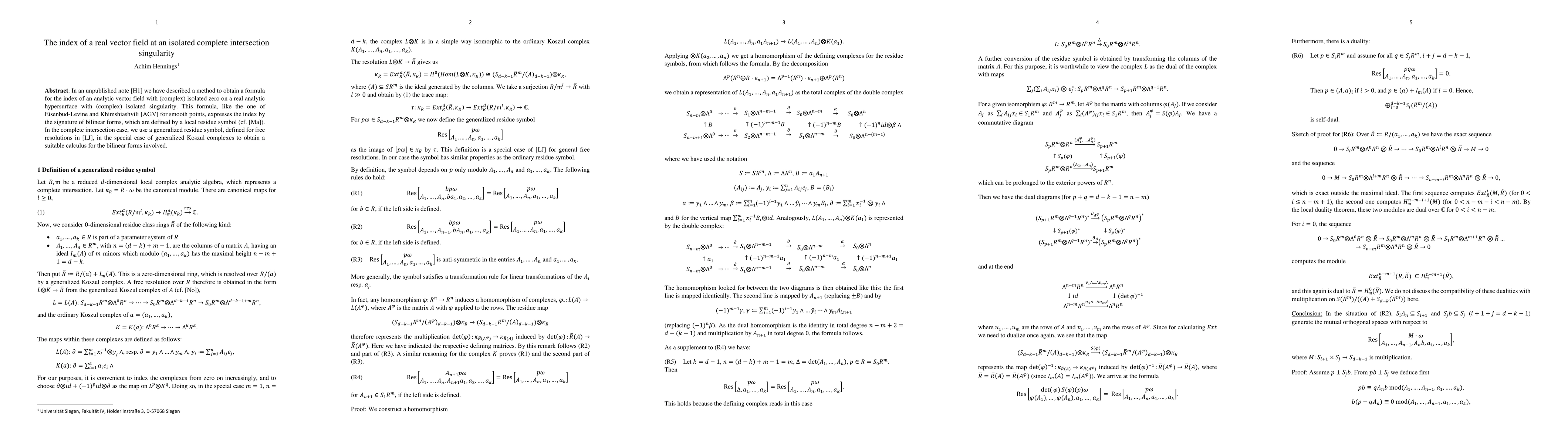 In an unpublished note [H1] we have described a method to obtain a formula for the index of an analytic vector field with (complex) isolated zero on a real analytic hypersurface with (complex) isolated singularity. This formula, like the one of Eisenbud-Levine and Khimshiashvili [AGV] for smooth points, expresses the index by the signature of bilinear forms, which are defined by a local residue symbol (cf. [Ma]). In the complete intersection case, we use a generalized residue symbol, defined for free resolutions in [LJ], in the special case of generalized Koszul complexes to obtain a suitable calculus for the bilinear forms involved.