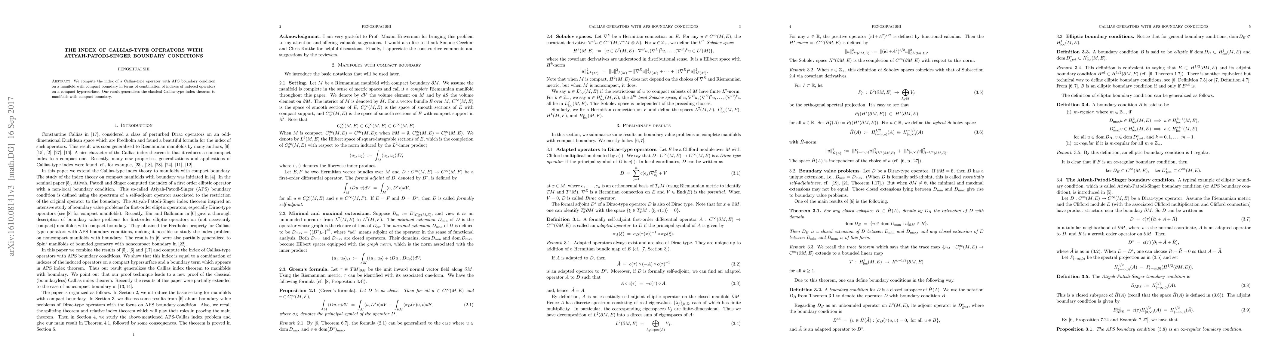 The paper computes the index of a Callias-type operator under Atiyah-Patodi-Singer boundary conditions on manifolds with compact boundaries, generalizing the classical index theorem to this setting. The result connects the index to combinations of indexes of induced operators on hypersurfaces.