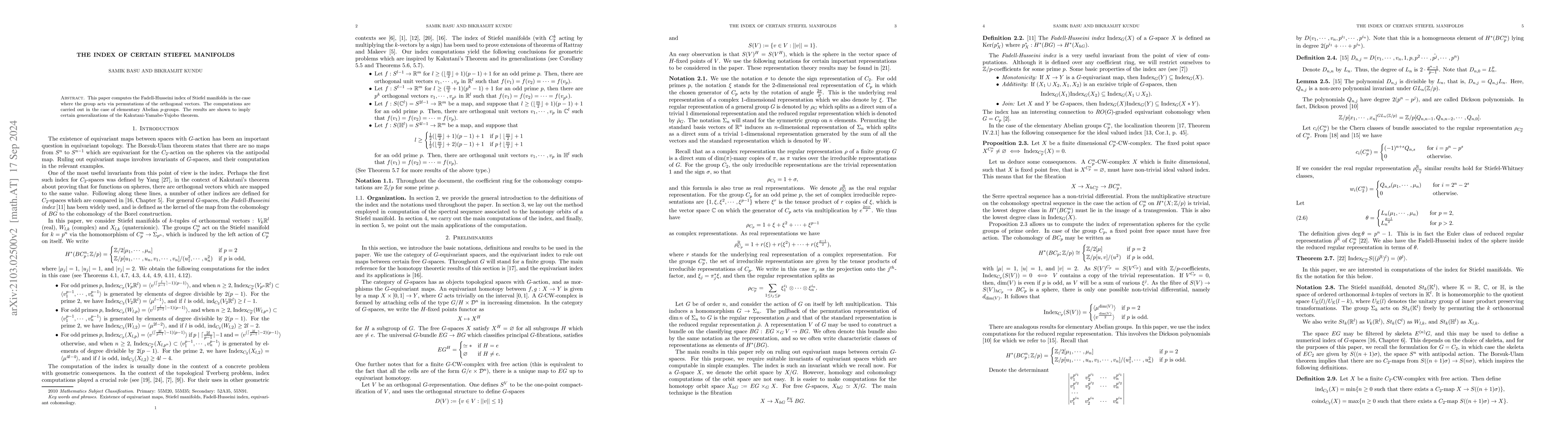 This paper computes the Fadell-Husseini index of Stiefel manifolds in the case where the group acts via permutations of the orthogonal vectors. The computations are carried out in the case of elementary Abelian $p$-groups. The results are shown to imply certain generalizations of the Kakutani-Yamabe-Yujobo theorem.