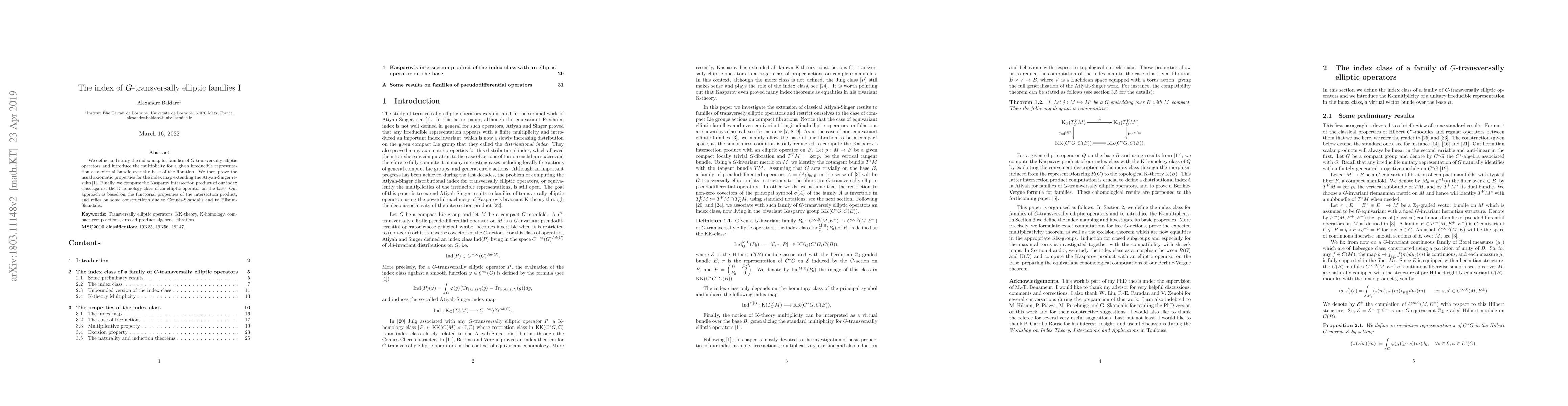 This paper defines and studies the index map for $G$-transversally elliptic operator families, proving axiomatic properties and extending Atiyah-Singer results. It computes the Kasparov intersection product using functorial properties, relying on constructions from Connes-Skandalis and Hilsum-Skandalis.