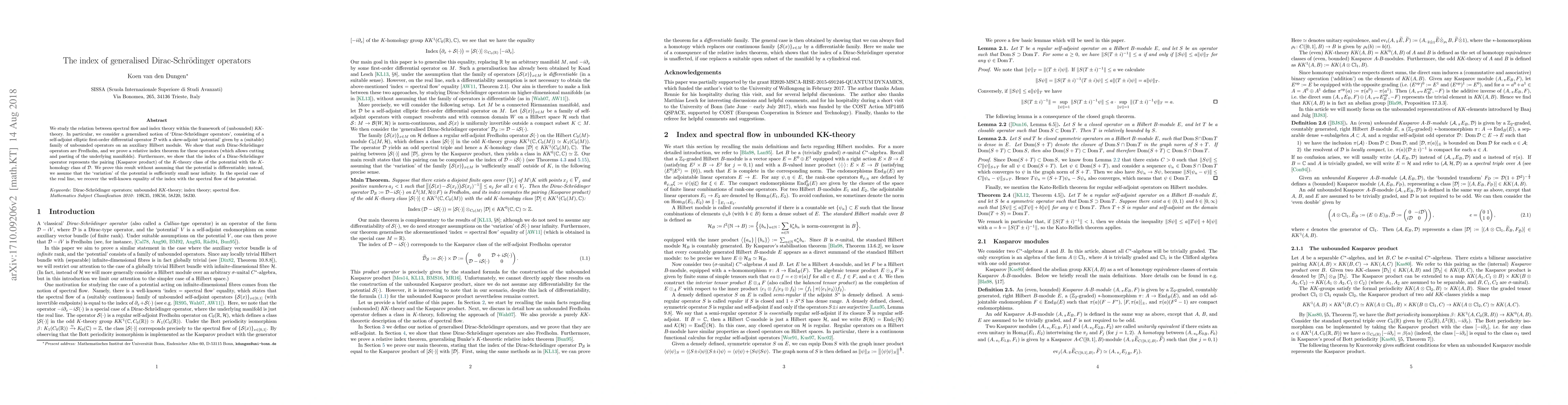 This paper explores the relationship between spectral flow and index theory in the context of generalised Dirac-Schr\"odinger operators, proving that these operators are Fredholm and establishing a relative index theorem. The index of such operators is shown to represent the Kasparov product of the potential's K-theory class and the differential operator's K-homology class, without requiring differentiability of the potential.