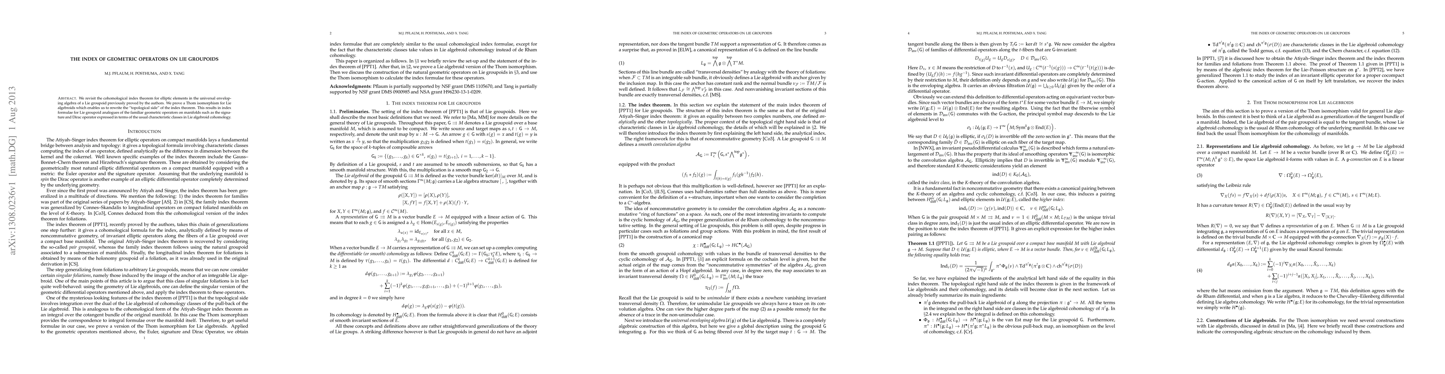 We revisit the cohomological index theorem for elliptic elements in the universal enveloping algebra of a Lie groupoid previously proved by the authors. We prove a Thom isomorphism for Lie algebroids which enables us to rewrite the "topological side" of the index theorem. This results in index formulae for Lie groupoid analogues of the familiar geometric operators on manifolds such as the signature and Dirac operator expressed in terms of the usual characteristic classes in Lie algebroid cohomology.