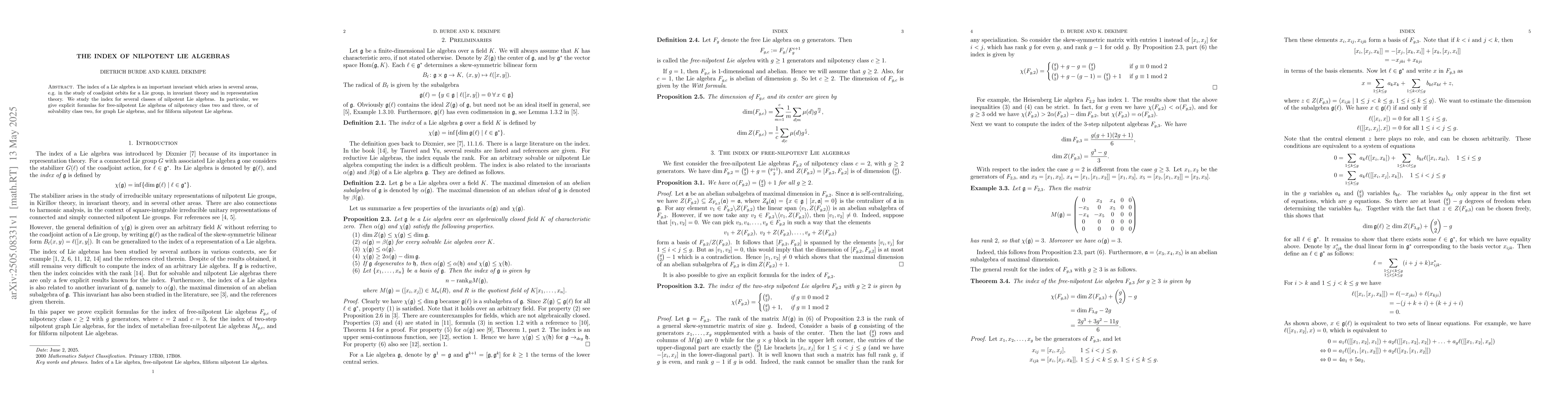 The paper presents novel explicit formulas for the index of various classes of nilpotent Lie algebras.