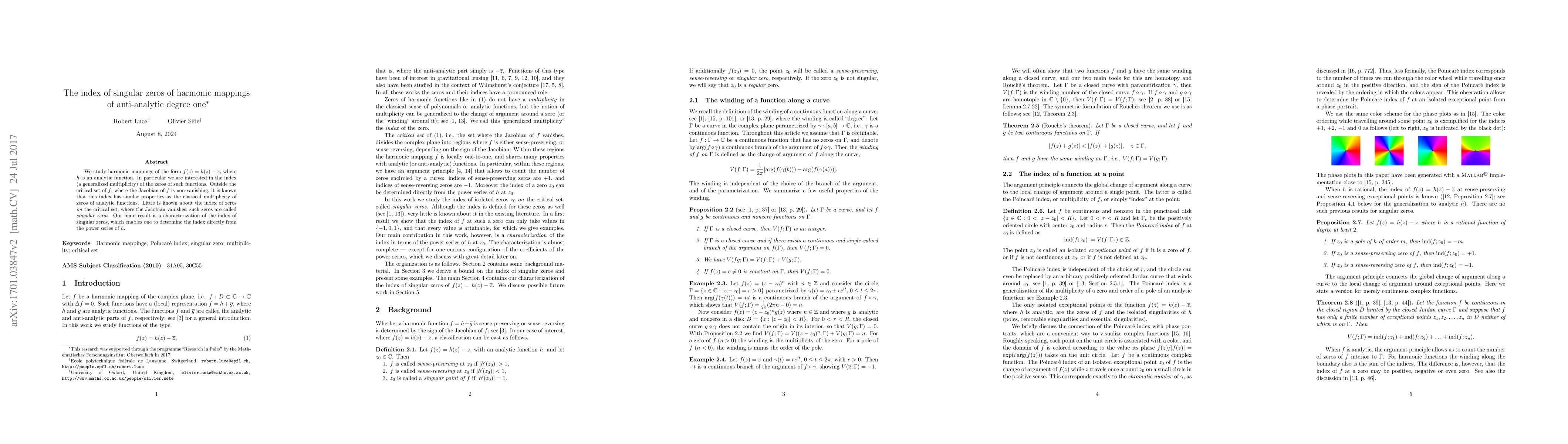This paper investigates harmonic mappings of the form $f(z) = h(z) - \overline{z}$, where $h$ is an analytic function, focusing on the index of their zeros. The authors characterize the index of singular zeros, where the Jacobian vanishes, providing a method to determine this index directly from the power series of $h$.