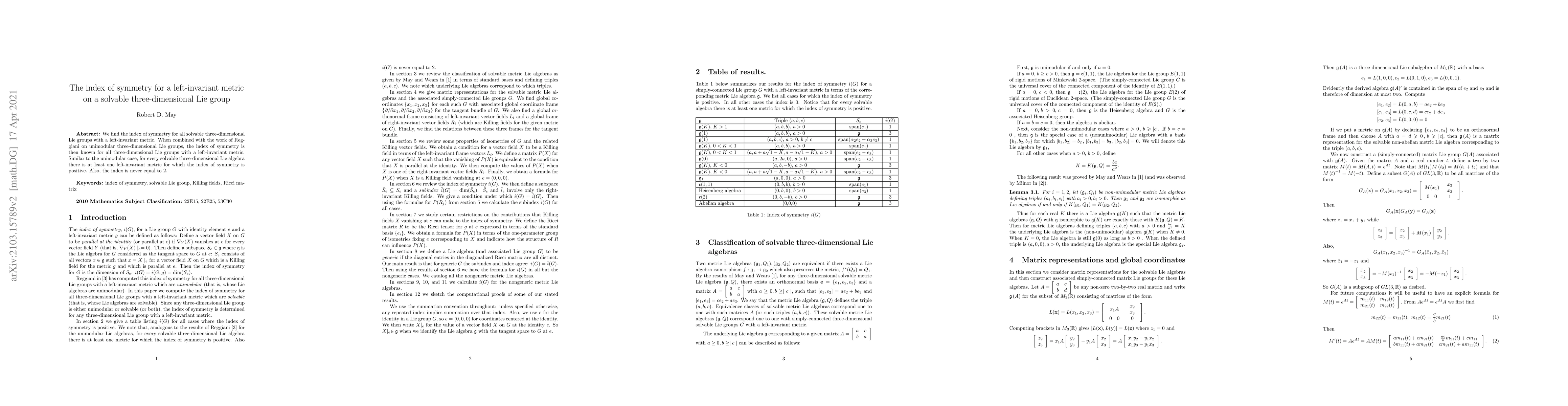 We find the index of symmetry for all solvable three-dimensional Lie groups with a left-invariant metric. When combined with the work of Reggiani on unimodular three-dimensional Lie groups, the index of symmetry is then known for all three-dimensional Lie groups with a left-invariant metric. Similar to the unimodular case, for every solvable three-dimensional Lie algebra there is at least one left-invariant metric for which the index of symmetry is positive. Also, the index is never equal to 2.
