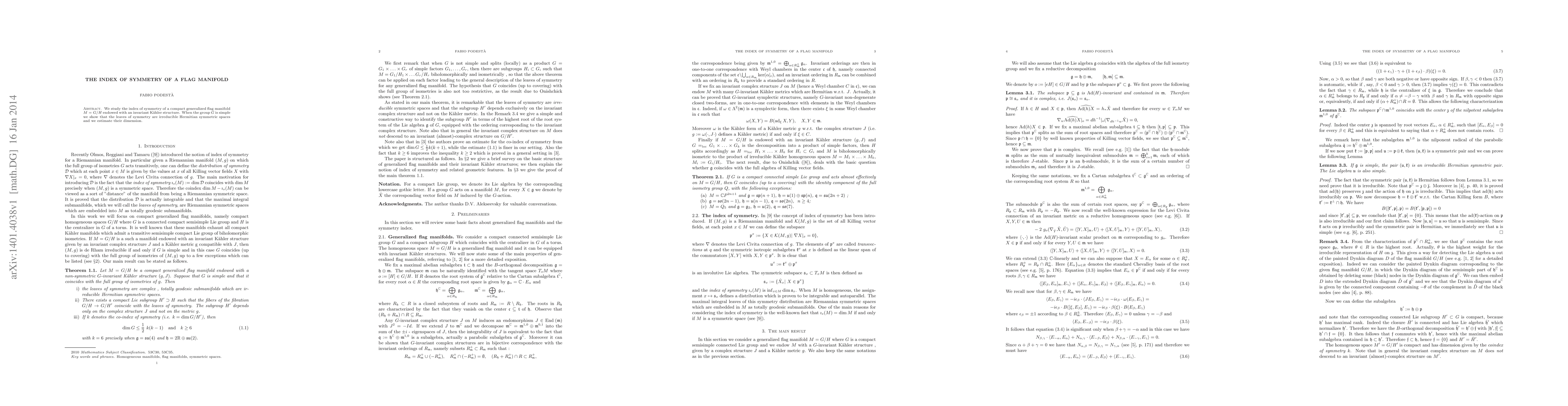 This paper investigates the index of symmetry for compact generalized flag manifolds with invariant Kähler structures, proving that for simple groups, the symmetry leaves are irreducible Hermitian symmetric spaces and estimating their dimensions.