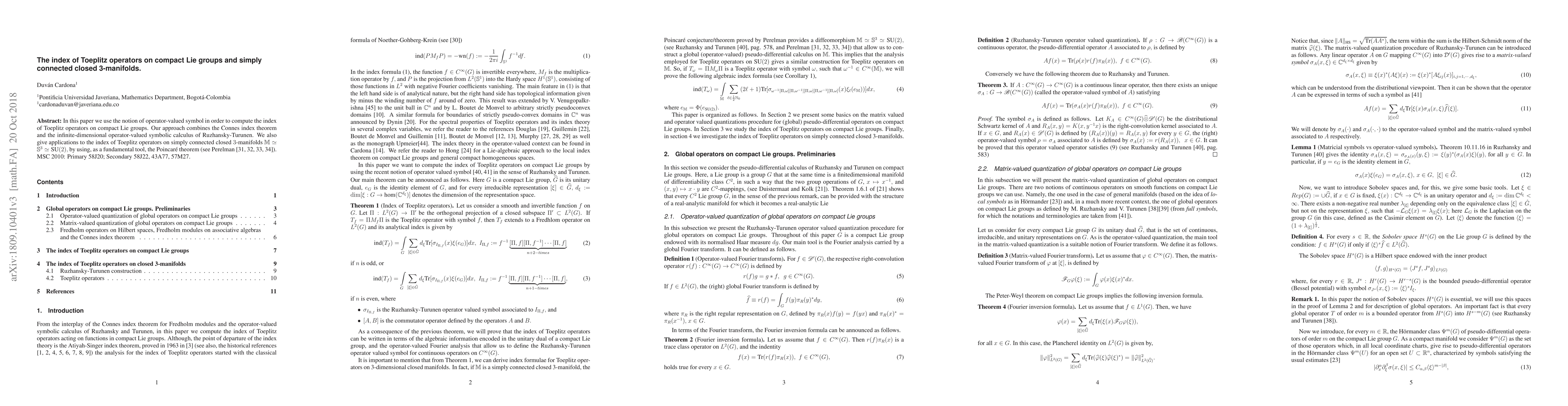 In this paper we use the notion of operator-valued symbol in order to compute the index of Toeplitz operators on compact Lie groups. Our approach combines the Connes index theorem and the infinite-dimensional operator-valued symbolic calculus of Ruzhansky-Turunen. We also give applications to the index of Toeplitz operators on simply connected closed $3$-manifolds $\mathbb{M}\simeq \mathbb{S}^3\simeq \textnormal{SU}(2) ,$ by using, as a fundamental tool, the Poincar\'e theorem (see Perelman [31,32,33,34])