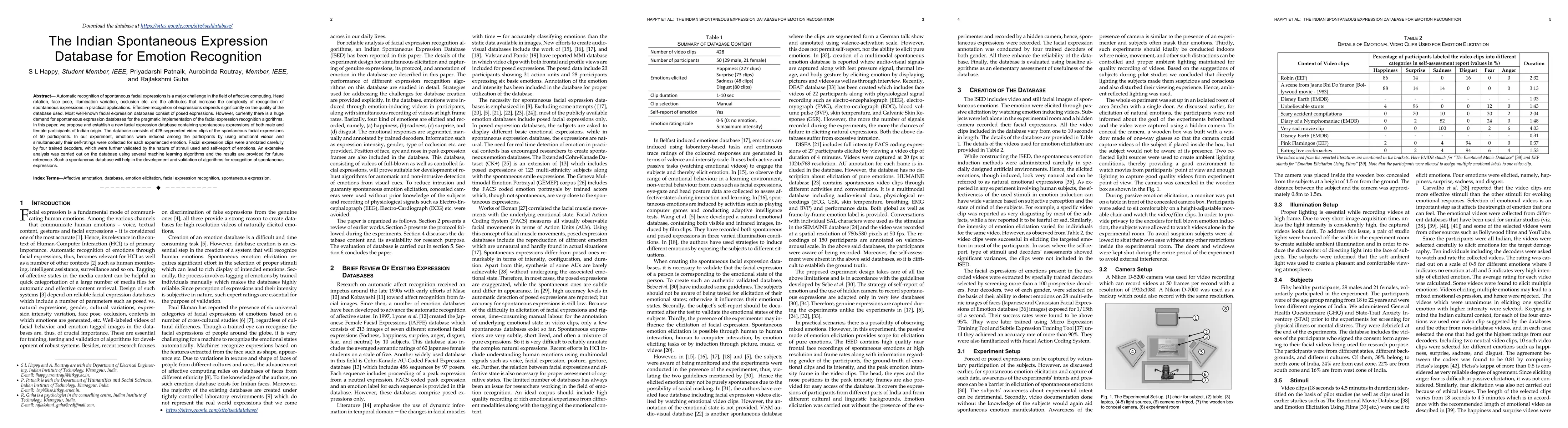 Automatic recognition of spontaneous facial expressions is a major challenge in the field of affective computing. Head rotation, face pose, illumination variation, occlusion etc. are the attributes that increase the complexity of recognition of spontaneous expressions in practical applications. Effective recognition of expressions depends significantly on the quality of the database used. Most well-known facial expression databases consist of posed expressions. However, currently there is a huge demand for spontaneous expression databases for the pragmatic implementation of the facial expression recognition algorithms. In this paper, we propose and establish a new facial expression database containing spontaneous expressions of both male and female participants of Indian origin. The database consists of 428 segmented video clips of the spontaneous facial expressions of 50 participants. In our experiment, emotions were induced among the participants by using emotional videos and simultaneously their self-ratings were collected for each experienced emotion. Facial expression clips were annotated carefully by four trained decoders, which were further validated by the nature of stimuli used and self-report of emotions. An extensive analysis was carried out on the database using several machine learning algorithms and the results are provided for future reference. Such a spontaneous database will help in the development and validation of algorithms for recognition of spontaneous expressions.