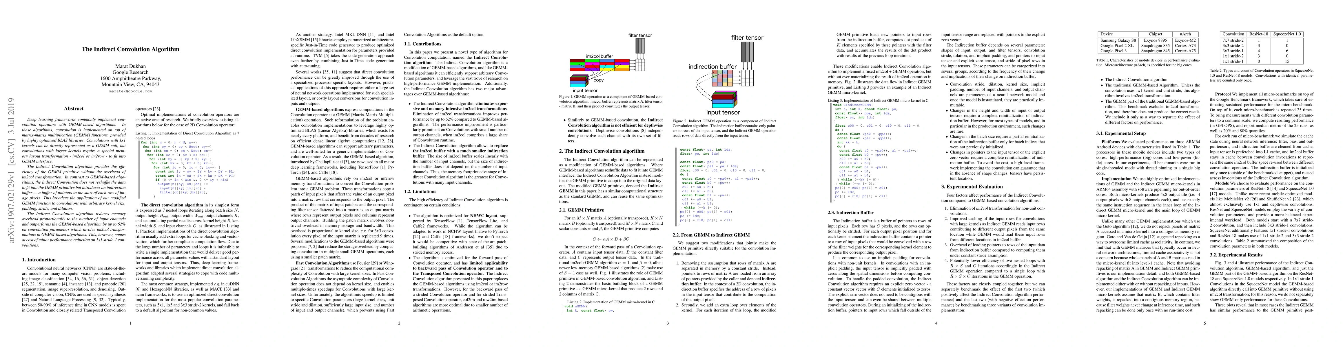 Deep learning frameworks commonly implement convolution operators with GEMM-based algorithms. In these algorithms, convolution is implemented on top of matrix-matrix multiplication (GEMM) functions, provided by highly optimized BLAS libraries. Convolutions with 1x1 kernels can be directly represented as a GEMM call, but convolutions with larger kernels require a special memory layout transformation - im2col or im2row - to fit into GEMM interface. The Indirect Convolution algorithm provides the efficiency of the GEMM primitive without the overhead of im2col transformation. In contrast to GEMM-based algorithms, the Indirect Convolution does not reshuffle the data to fit into the GEMM primitive but introduces an indirection buffer - a buffer of pointers to the start of each row of image pixels. This broadens the application of our modified GEMM function to convolutions with arbitrary kernel size, padding, stride, and dilation. The Indirect Convolution algorithm reduces memory overhead proportionally to the number of input channels and outperforms the GEMM-based algorithm by up to 62% on convolution parameters which involve im2col transformations in GEMM-based algorithms. This, however, comes at cost of minor performance reduction on 1x1 stride-1 convolutions.