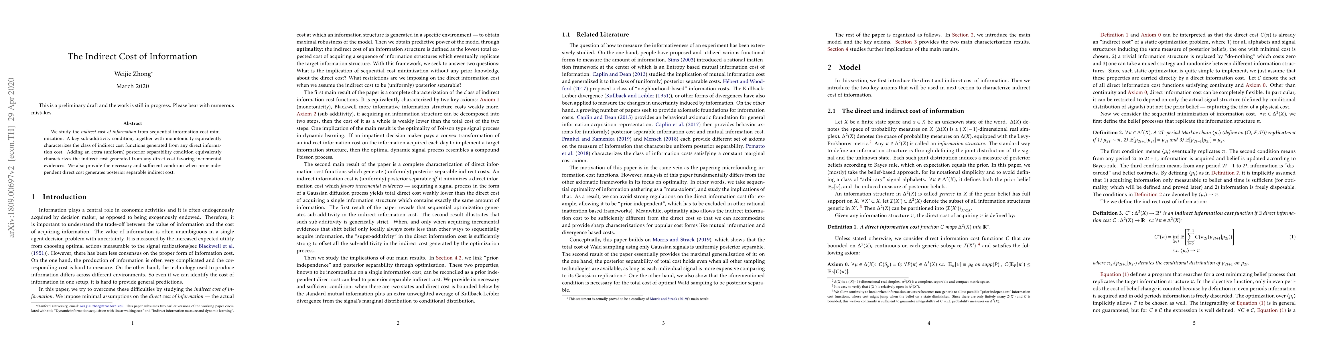 This paper explores the indirect cost of information derived from sequential information cost minimization, identifying key sub-additivity and monotonicity conditions that characterize these indirect costs. It also introduces a posterior separability condition to define indirect costs favoring incremental evidences.