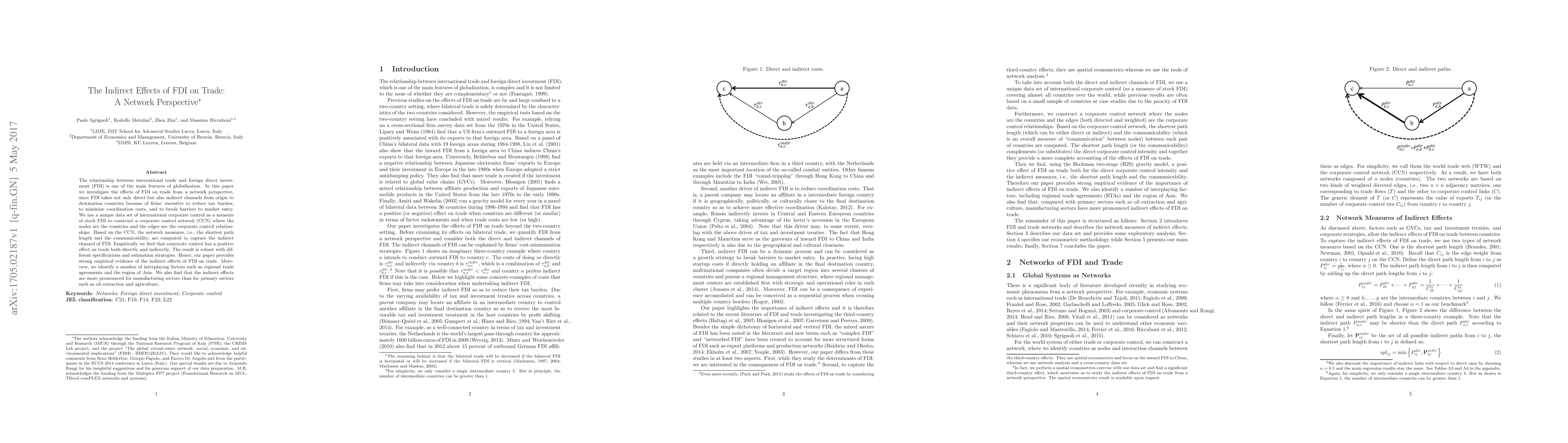 This paper examines the indirect effects of foreign direct investment (FDI) on trade through a network perspective, using a corporate control network to measure FDI. It finds that corporate control positively influences trade both directly and indirectly, with stronger effects in manufacturing sectors and in regions like Asia.