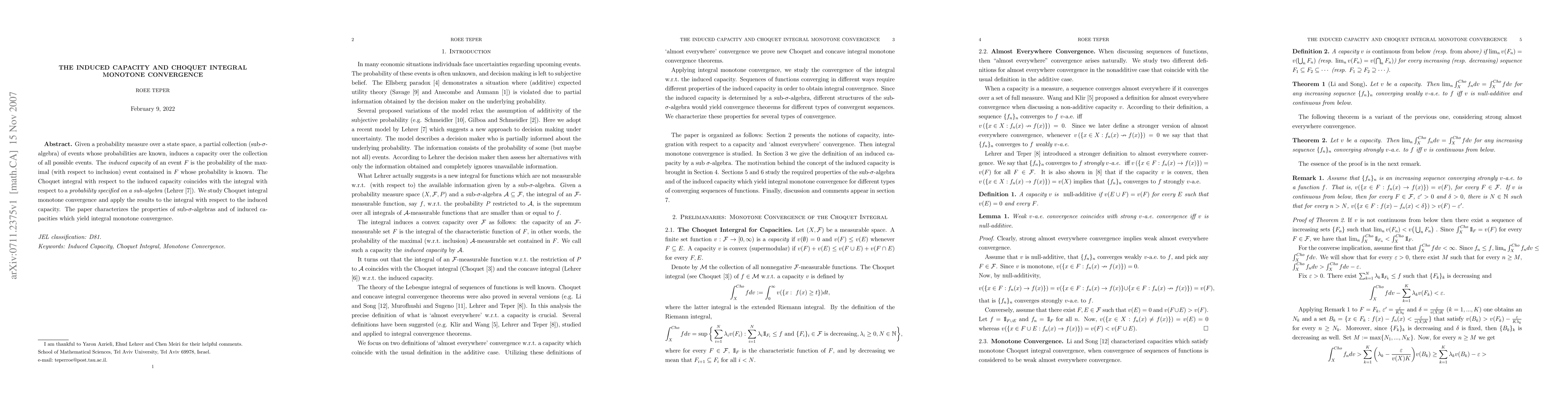 This paper investigates the induced capacity and Choquet integral monotone convergence under a given probability measure and a partial collection of events. It characterizes the properties of sub-σ-algebras and induced capacities that ensure the monotone convergence of the Choquet integral.