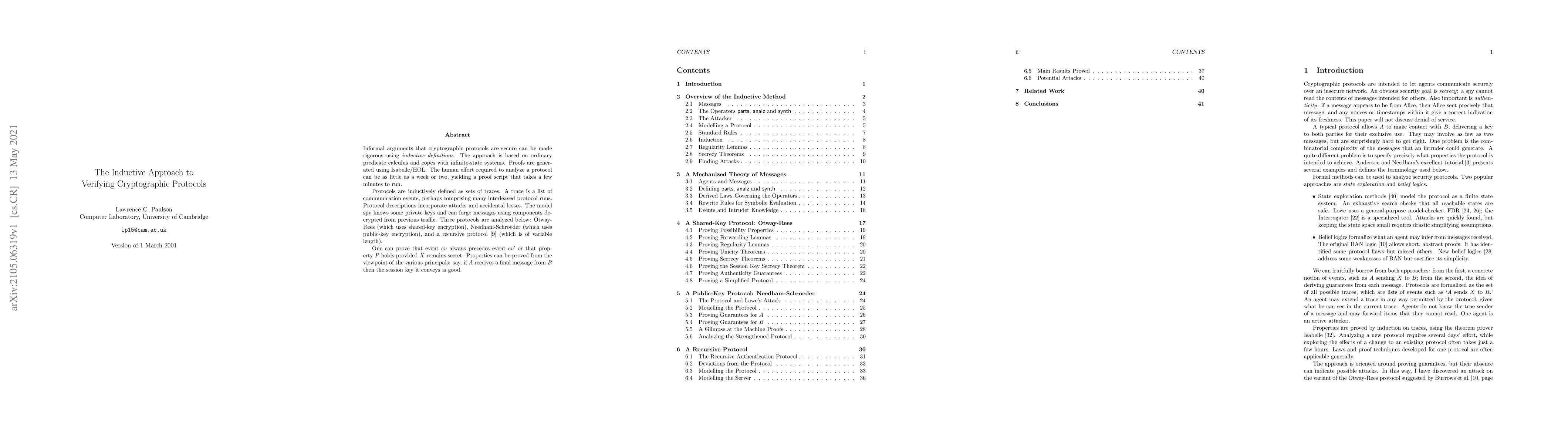 This paper presents an inductive approach to rigorously verify cryptographic protocols using predicate calculus and Isabelle/HOL, enabling proofs for infinite-state systems. Three protocols—Otway-Rees, Needham-Schroeder, and Bull-Otway—are analyzed, demonstrating that the method can yield proofs in a week or two, with automated scripts running in minutes.