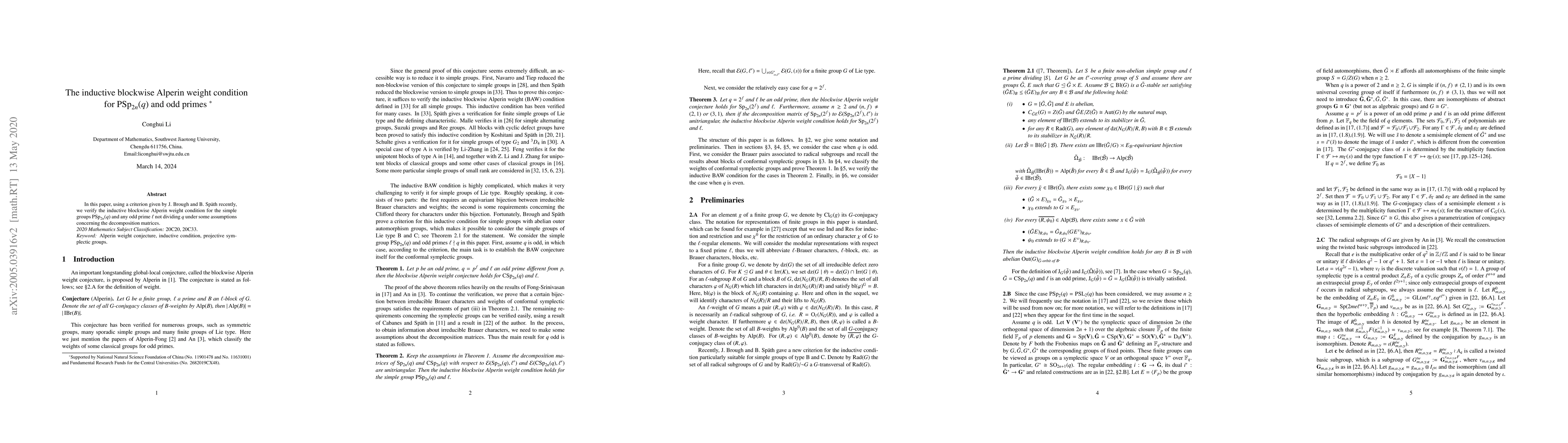 Summary: The paper verifies the inductive blockwise Alperin weight condition for the simple groups PSp2n(q) using a criterion by Brough and Spaeth, focusing on odd primes not dividing q, contingent on assumptions about decomposition matrices.