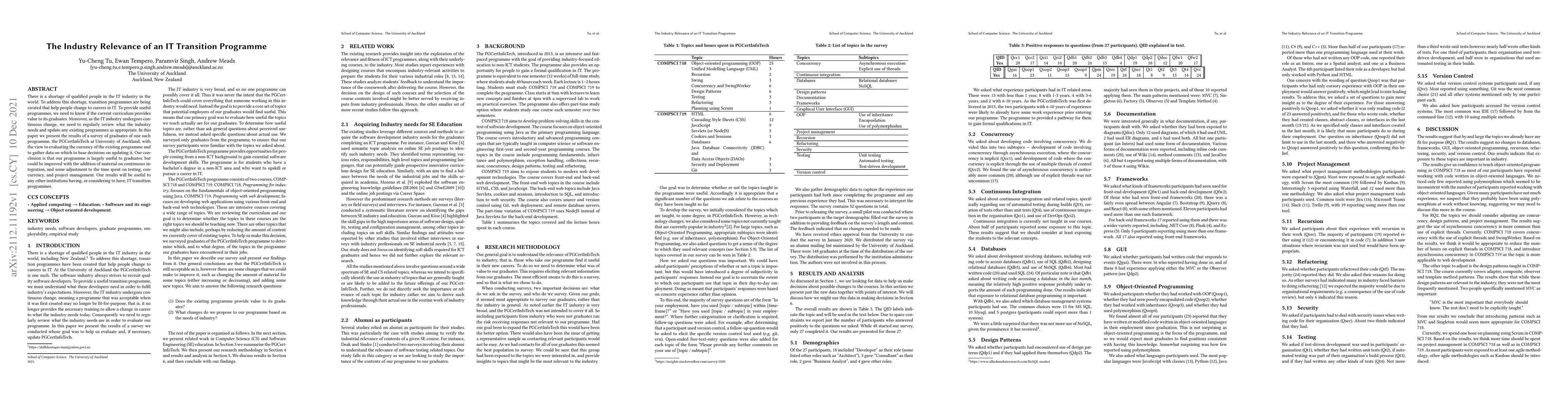 There is a shortage of qualified people in the IT industry in the world. To address this shortage, transition programmes are being created that help people change to careers in IT. To provide useful programmes, we need to know if the current curriculum provides value to its graduates. Moreover, as the IT industry undergoes continuous change, we need to regularly review what the industry needs and update any existing programmes as appropriate. In this paper we present the results of a survey of graduates of one such programme, the PGCertInfoTech at University of Auckland, with the view to evaluating the currency of the existing programme and to gather data on which to base decisions on updating it. Our conclusion is that our programme is largely useful to graduates, but could be improved with the addition of material on continuous integration, and some adjustment to the time spent on testing, concurrency, and project management. Our results will be useful to any other institutions having, or considering to have, IT transition programmes.