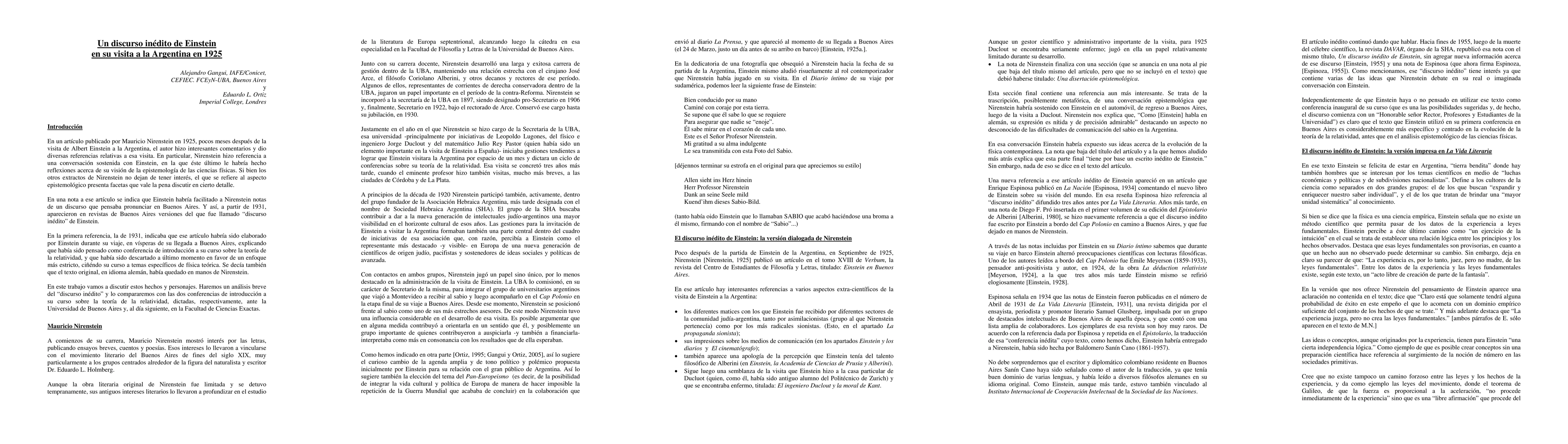 This paper explores Albert Einstein's 1925 visit to Buenos Aires, focusing on a set of notes he left with Mauricio Nirenstein, which became known as the "inedito." It compares these notes with Einstein's actual lectures at the University of Buenos Aires and Faculty of Science, analyzing the content and context of the visit.
