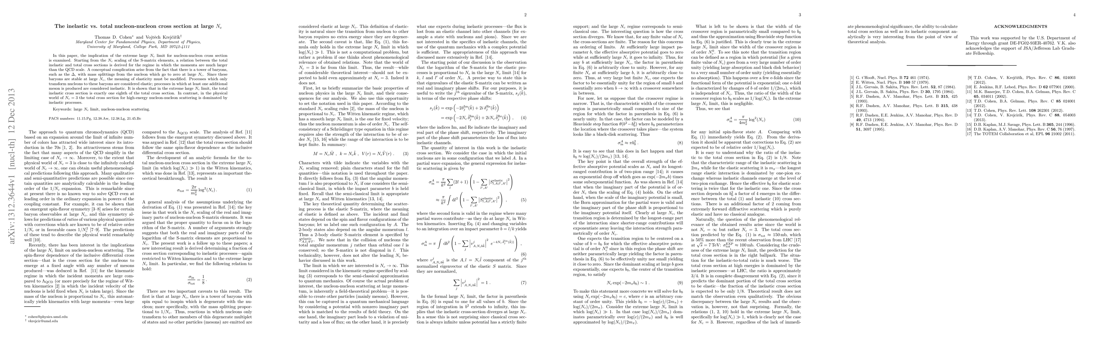 This paper explores the nucleon-nucleon cross section in the large $N_c$ limit, deriving a relation between total and inelastic cross sections for high-momentum interactions. It redefines elasticity to include transformations to stable baryons like the $\Delta$, showing that in the extreme large $N_c$ limit, the total inelastic cross section is one eighth of the total cross section.