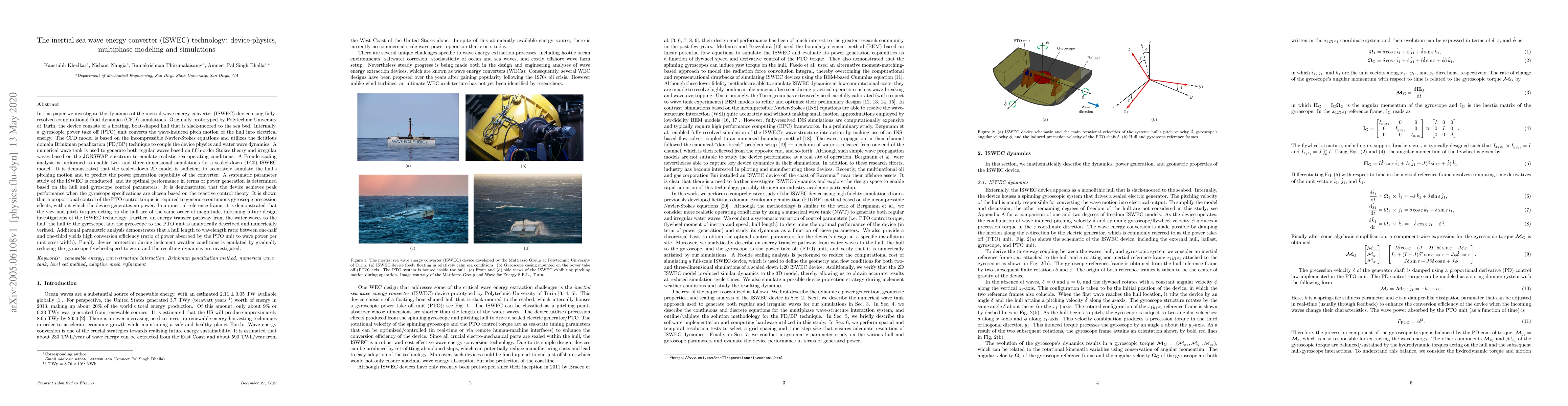 In this paper we investigate the dynamics of the inertial wave energy converter (ISWEC) device using fully-resolved computational fluid dynamics (CFD) simulations. Originally prototyped by Polytechnic University of Turin, the device consists of a floating, boat-shaped hull that is slack-moored to the sea bed. Internally, a gyroscopic power take off (PTO) unit converts the wave-induced pitch motion of the hull into electrical energy. The CFD model is based on the incompressible Navier-Stokes equations and utilizes the fictitious domain Brinkman penalization technique to couple the device physics and water wave dynamics. A numerical wave tank is used to emulate realistic sea operating conditions. A Froude scaling analysis is performed to enable two- and three-dimensional simulations for a scaled-down (1:20) ISWEC model. It is demonstrated that the scaled-down 2D model is sufficient to accurately simulate the hull's pitching motion and to predict the power generation capability of the converter. A systematic parameter study of the ISWEC is conducted, and its optimal performance in terms of power generation is determined based on the hull and gyroscope control parameters. It is demonstrated that the device achieves peak performance when the gyroscope specifications are chosen based on reactive control theory. It is shown that a proportional control of the PTO control torque is required to generate continuous gyroscope precession effects, without which the device generates no power. In an inertial reference frame, it is demonstrated that the yaw and pitch torques acting on the hull are of the same order of magnitude, informing future design investigations of the ISWEC technology. Further, an energy transfer pathway from the water waves to the hull, the hull to the gyroscope, and the gyroscope to the PTO unit is analytically described and numerically verified.