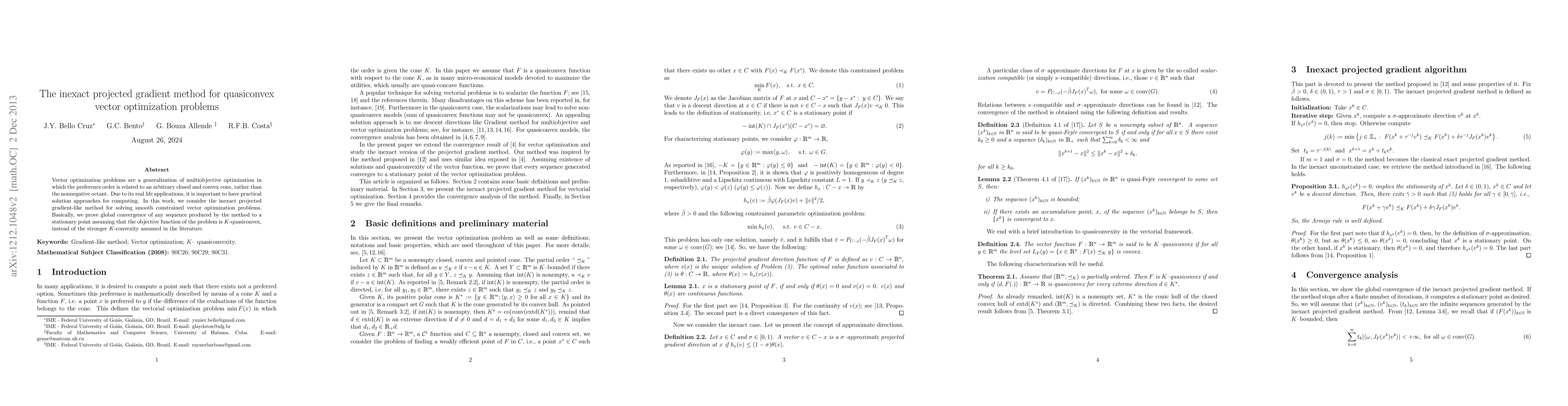 This paper proposes an inexact projected gradient method for solving smooth constrained vector optimization problems, proving global convergence to a stationary point under the assumption that the objective function is $K$-quasiconvex, rather than requiring the stronger $K$-convexity condition typically assumed in the literature.