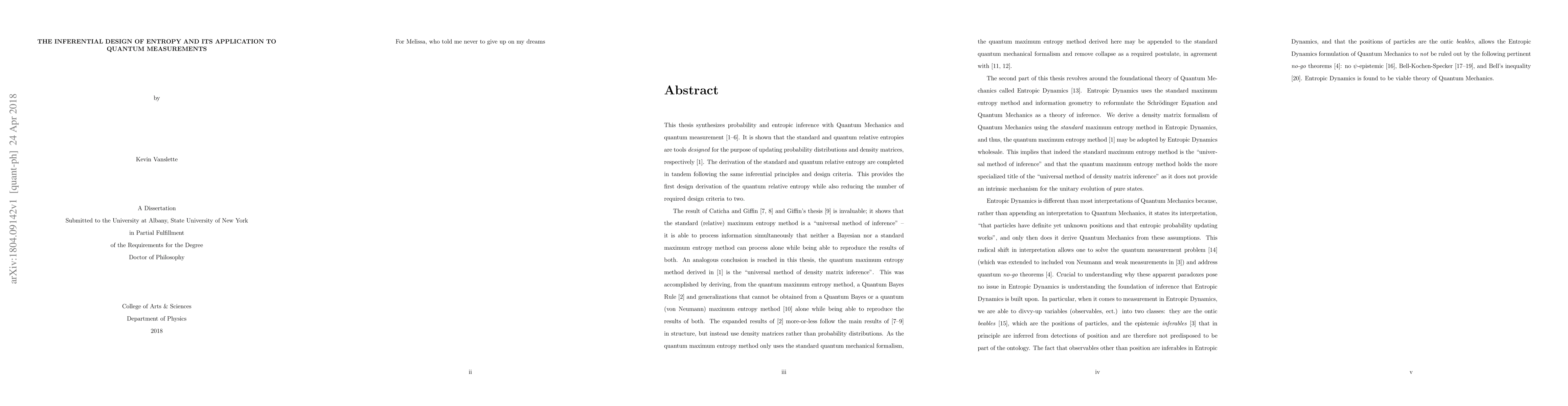 This thesis synthesizes probability and entropic inference with Quantum Mechanics (QM) and quantum measurement [1-6]. It is shown that the standard and quantum relative entropies are tools designed for the purpose of updating probability distributions and density matrices, respectively [1]. The derivation of the standard and quantum relative entropies are completed in tandem and follow from the same inferential principle - the principle of minimal updating [21,66]. As the quantum maximum entropy method is derived using the standard quantum mechanical formalism, the quantum maximum entropy method may be appended to the standard quantum mechanical formalism and remove collapse as a required postulate, in agreement with [11]. The quantum maximum entropy method is found to be a "universal method of density matrix inference" as it can process information about data and moments simultaneously (giving joint generalized quantum inference solutions), which when processed separately gives the Quantum Bayes Rule [2,39] or a canonical quantum (von Neumann) maximum entropy solution [10], respectively, as special cases. The second part of this thesis revolves around a foundational theory of QM called Entropic Dynamics (ED) [13]. Rather than appending an interpretation to QM, ED states its interpretation, "that particles have definite, yet unknown, positions and that entropic probability updating works" - only then does ED derive QM as an application of inference consistent with these assumptions. This shift in interpretation allows one to solve the quantum measurement problem [3,14] and avoid being ruled out by quantum no-go theorems [4]. Observables are divvied-up into two classes in ED: they are the ontic "beables" [15] (particle position), and the epistemic "inferables" [3], which are not predisposed to be part of the ontology as they are inferred in general from position detections.