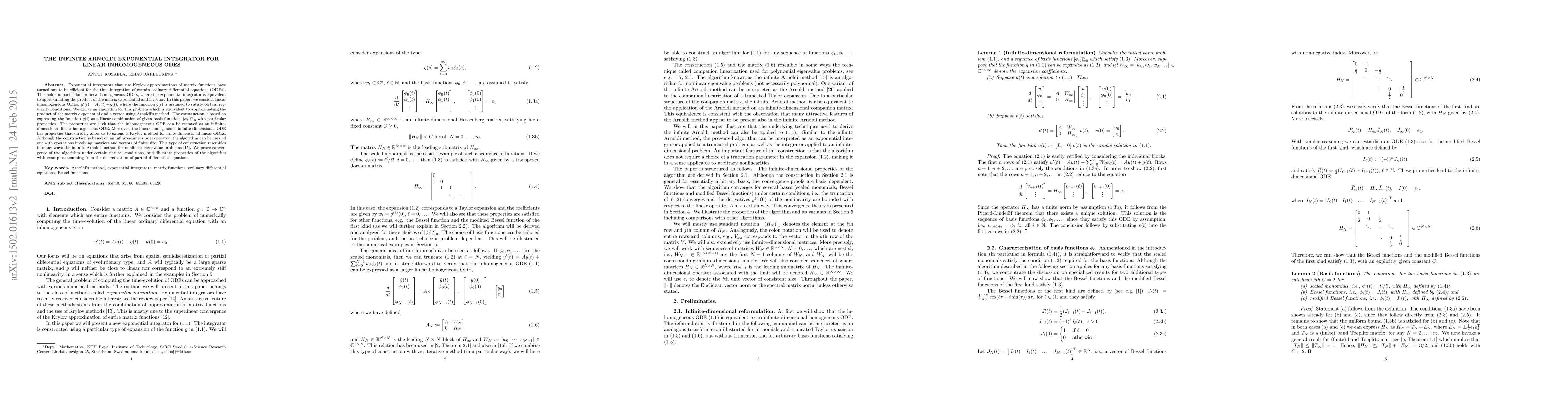 This paper develops an infinite Arnoldi exponential integrator for solving linear inhomogeneous ordinary differential equations (ODEs) by approximating the matrix exponential and a vector using Arnoldi's method. The algorithm is shown to converge under certain conditions and is demonstrated through examples related to discretized partial differential equations.