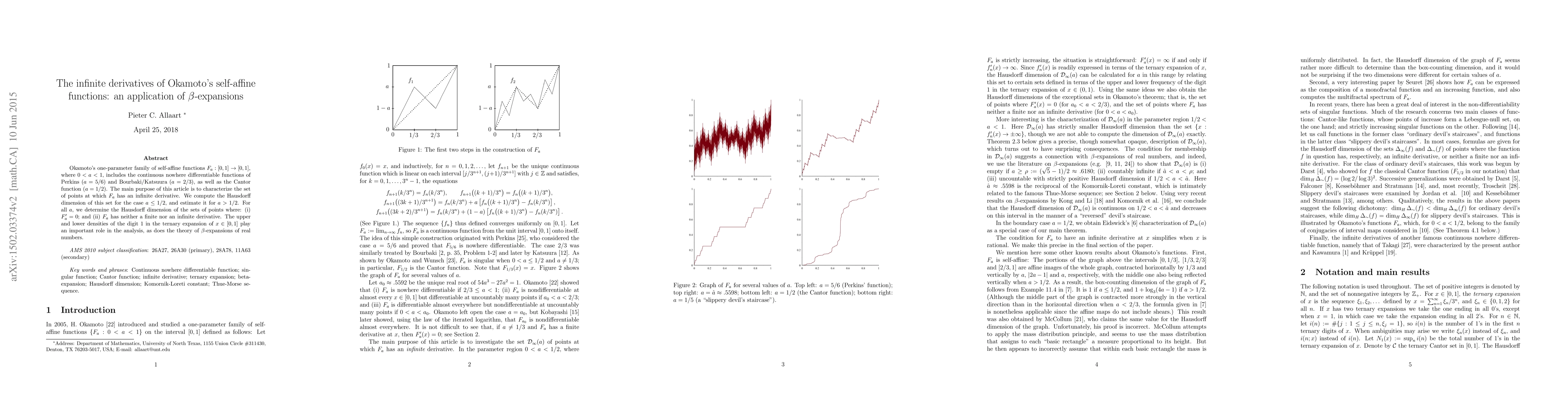 Okamoto's one-parameter family of self-affine functions $F_a: [0,1]\to[0,1]$, where $01/2$. For all $a$, we determine the Hausdorff dimension of the sets of points where: (i) $F_a'=0$; and (ii) $F_a$ has neither a finite nor an infinite derivative. The upper and lower densities of the digit $1$ in the ternary expansion of $x\in[0,1]$ play an important role in the analysis, as does the theory of $\beta$-expansions of real numbers.