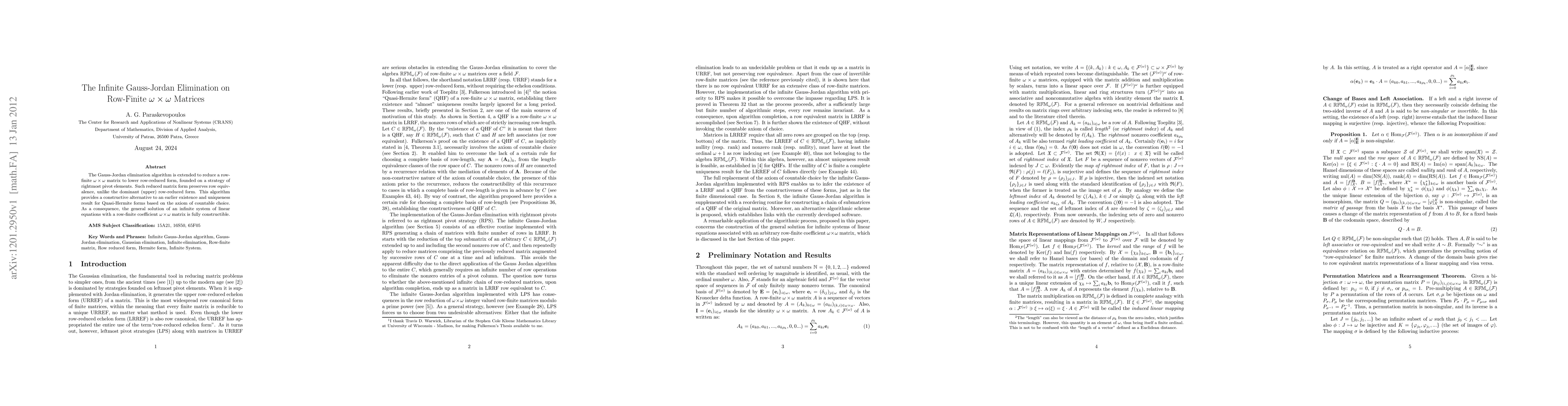 The Gauss-Jordan elimination algorithm is extended to reduce a row-finite $\omega\times\omega$ matrix to lower row-reduced form, founded on a strategy of rightmost pivot elements. Such reduced matrix form preserves row equivalence, unlike the dominant (upper) row-reduced form. This algorithm provides a constructive alternative to an earlier existence and uniqueness result for Quasi-Hermite forms based on the axiom of countable choice. As a consequence, the general solution of an infinite system of linear equations with a row-finite coefficient $\omega\times\omega$ matrix is fully constructible.